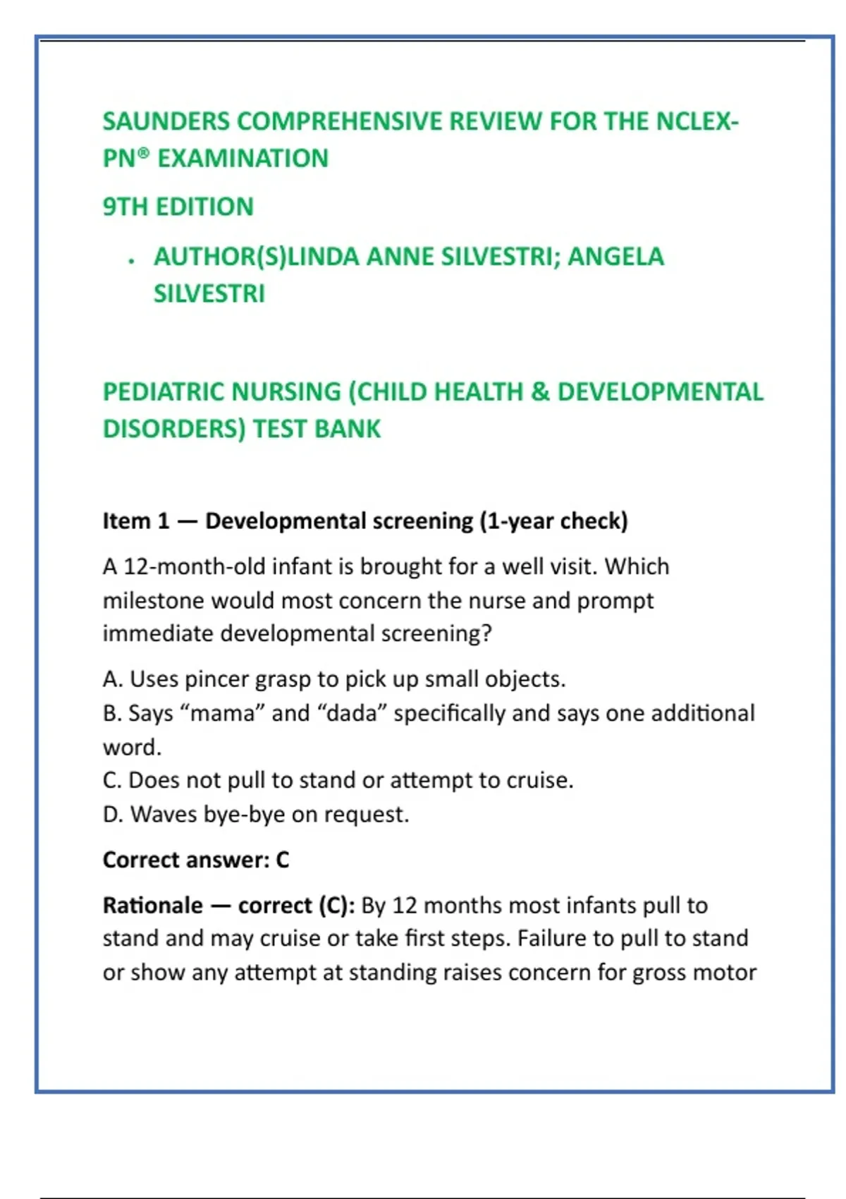 Rationale — correct (C): By 12 months most infants pull to