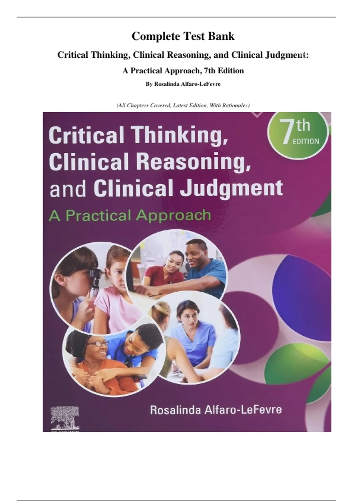 Complete Test Bank Critical Thinking, Clinical Reasoning, and Clinical Judgment: A Practical Approach, 7th Edition. By Rosalinda Alfaro-LeFevre (All Chapters Covered, Latest Edition, With Rationales) Critical Thinking, Clinical Reasoning, and Clinical Judgment: A Practical Approach, 7th Edition brings these concepts to life through engaging text, diverse learning activities, and real-life examples. Easy-to-understand language and a "how-to" approach equip you to become a sensible, resilient critical thinker with the clinical reasoning skills you need to think think through complex issues and make sound clinical decisions. This edition emphasizes readiness for clinical practice and the Next Generation NCLEX exam, with a focus on systems thinking, interprofessional practice, nursing skills for the 21st century, and Quality and Safety for Nursing Education (QSEN) competencies.