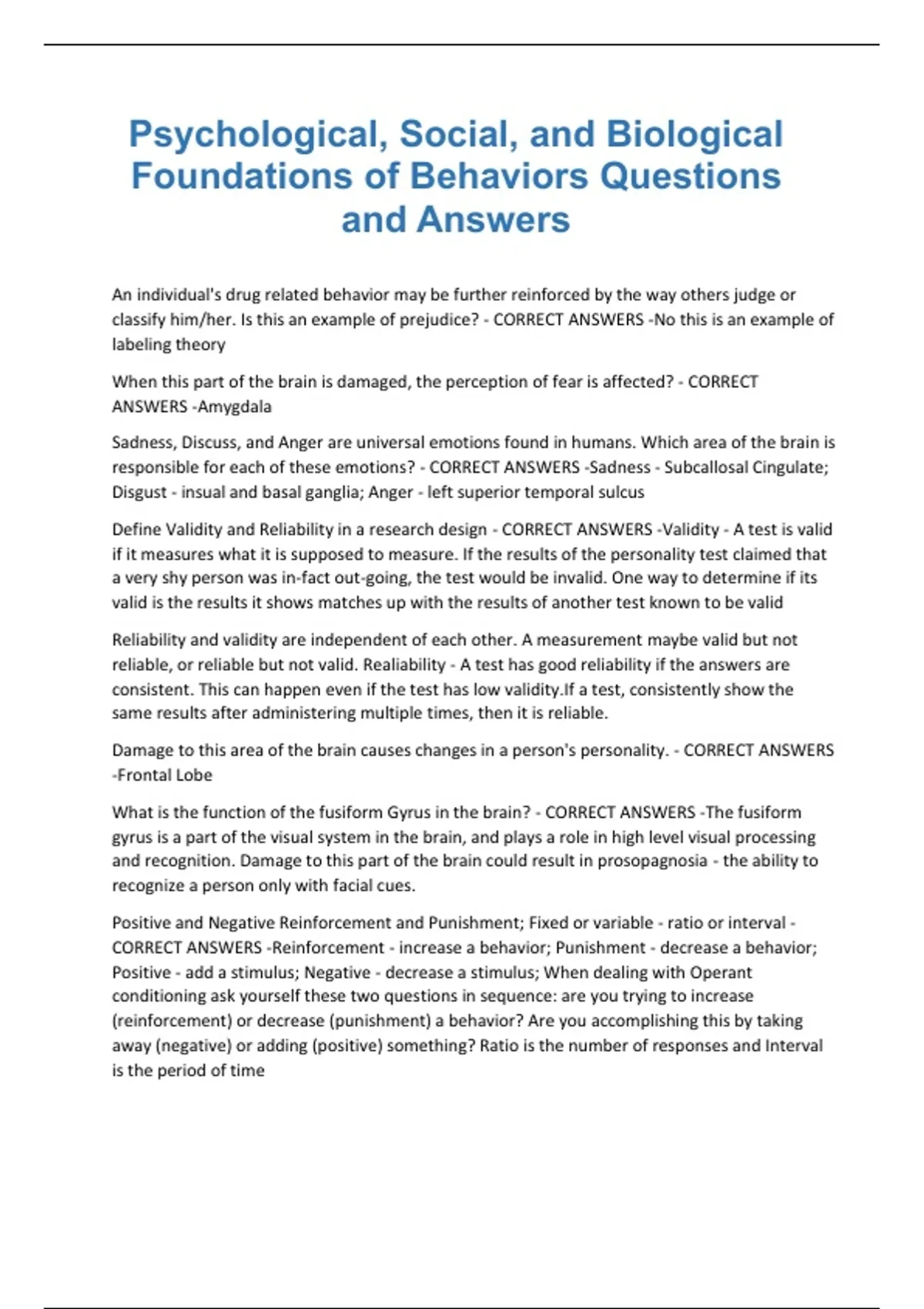 CORRECT ANSWERS -Reinforcement - increase a behavior; Punishment - decrease a behavior;