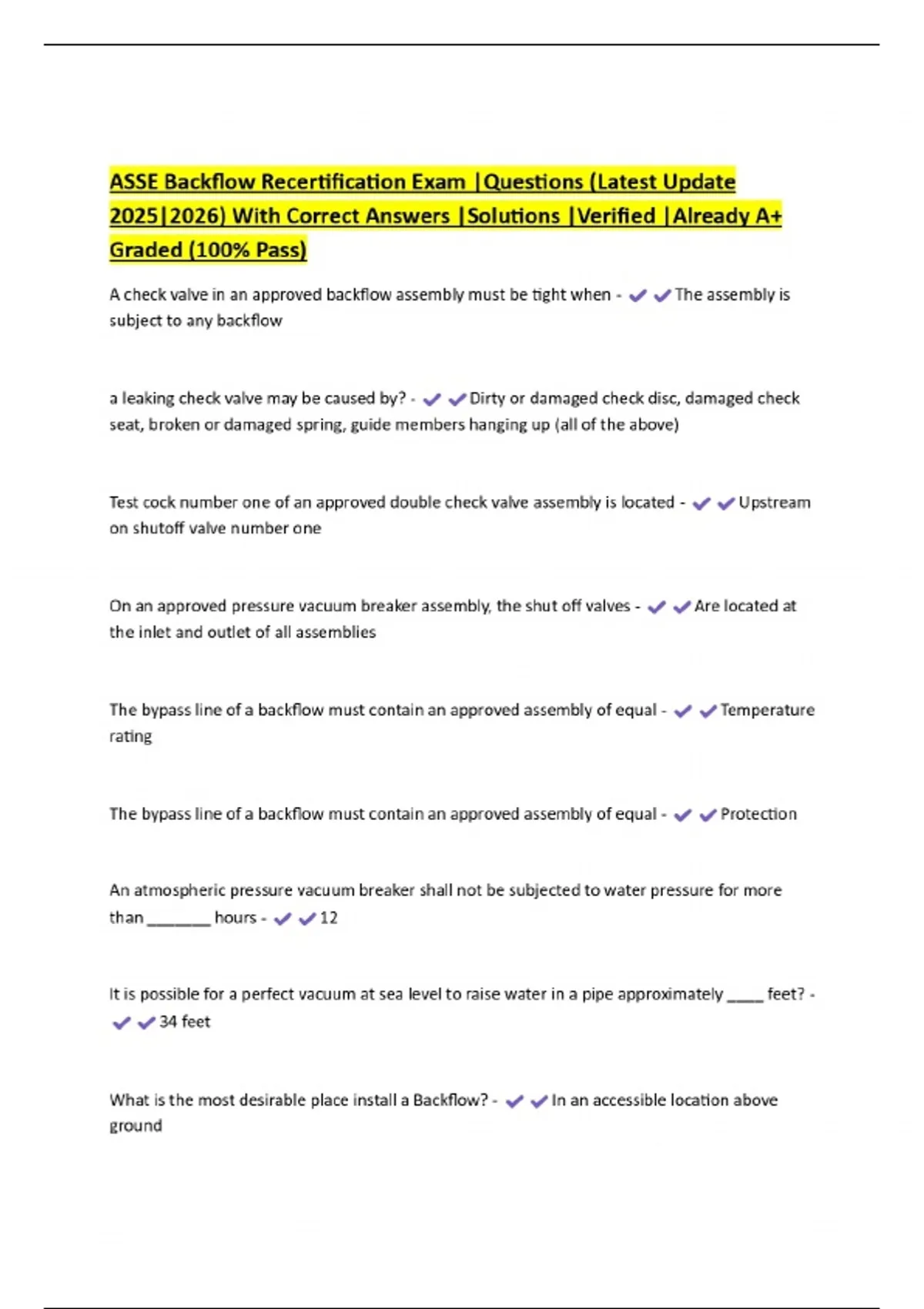 ASSE Backflow Recertification Exam |Questions (Latest Update 2025|2026) With Correct Answers |Solutions |Verified |Already A+ Graded (100% Pass)