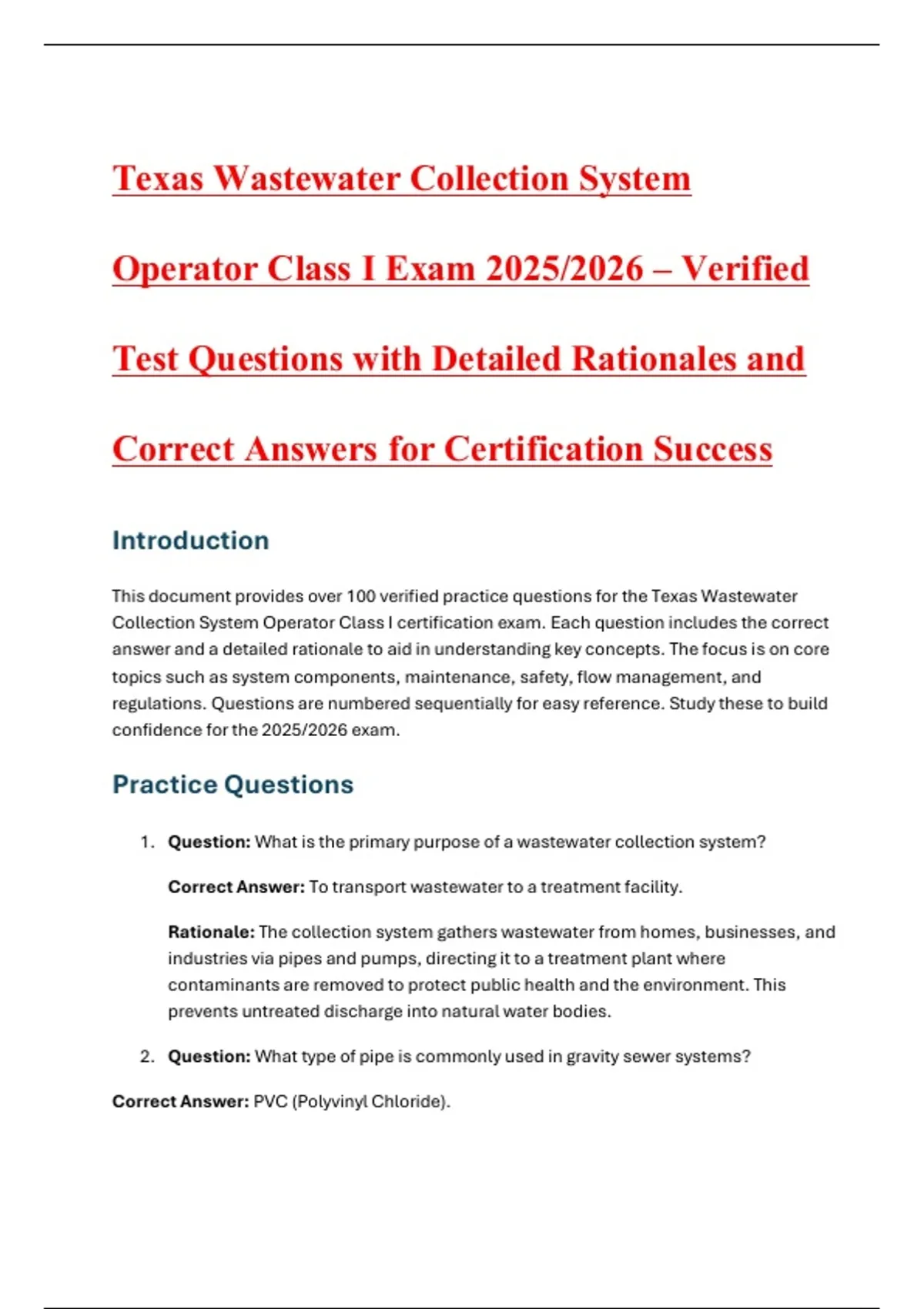 This study document contains over 100 verified practice questions designed for the Texas Wastewater Collection System Operator Class I certification exam for 2025/2026. Each question includes the correct answer and a detailed explanation to strengthen understanding of essential topics such as system design, flow management, safety, regulations, maintenance, and hydraulics. Ideal for students and operators preparing for the TCEQ Class I certification, this comprehensive resource ensures complete exam readiness through clear rationales and applied examples.