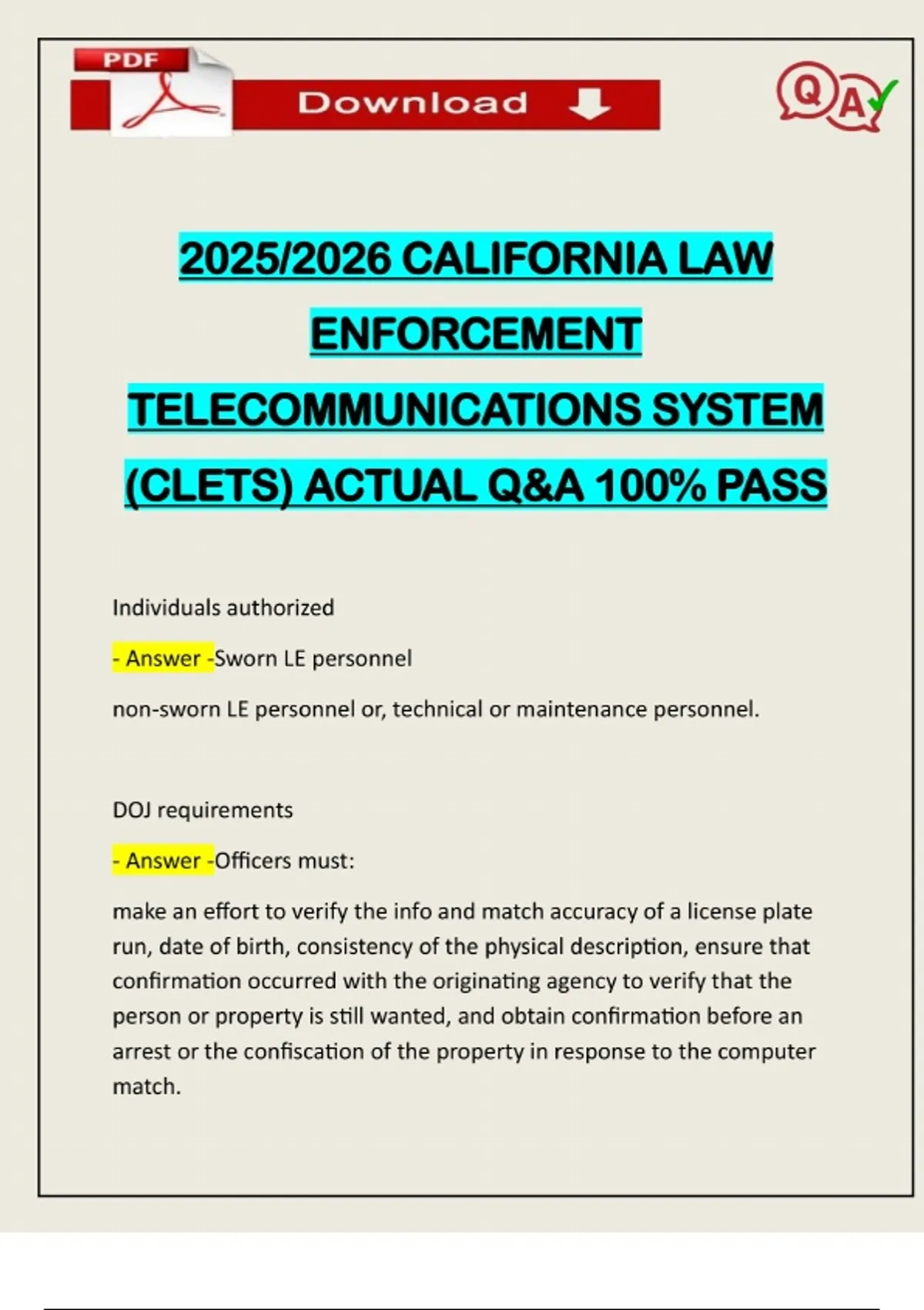 2025/2026 CALIFORNIA LAW ENFORCEMENT TELECOMMUNICATIONS SYSTEM (CLETS) ACTUAL Q&A 100% PASS