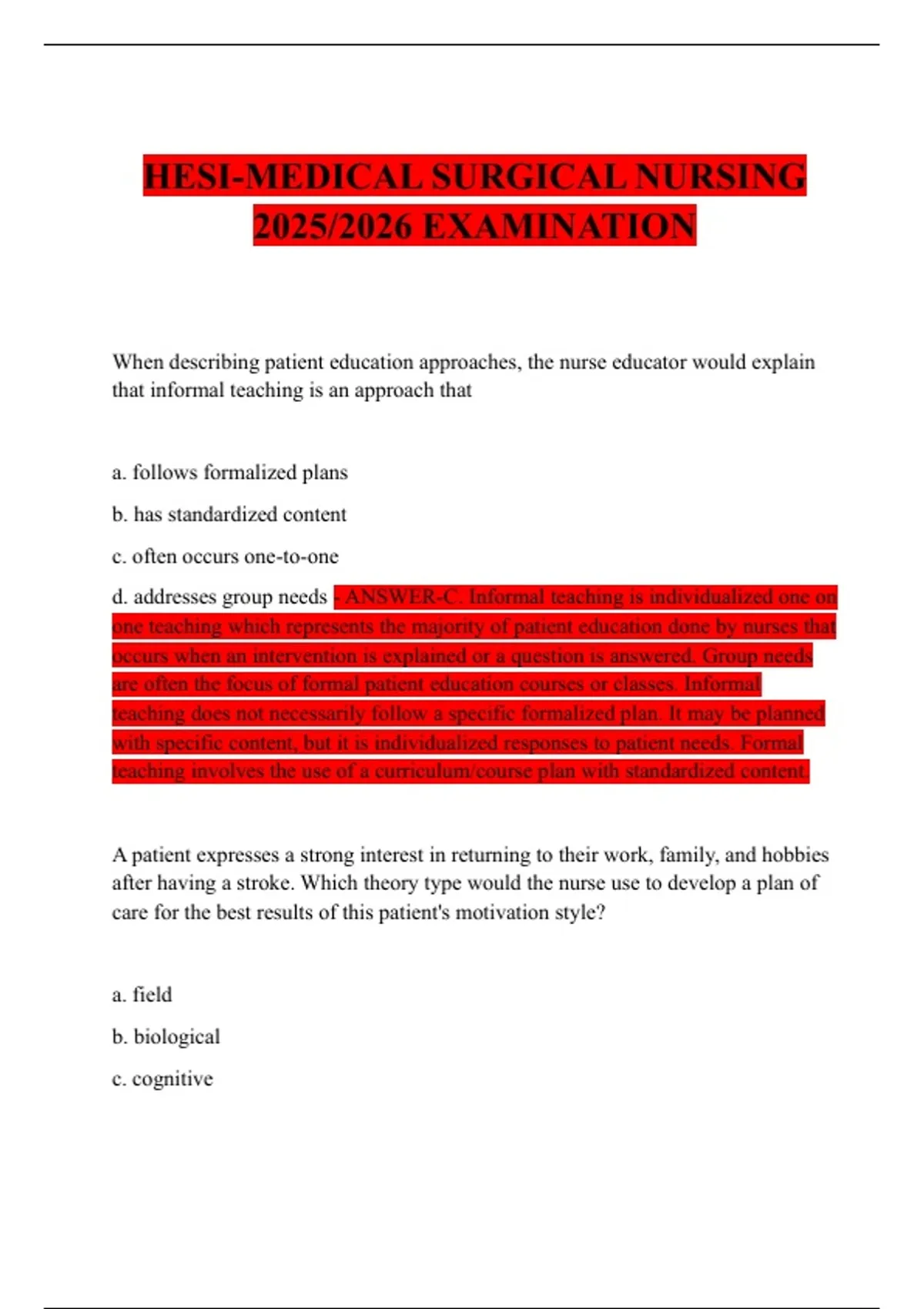 d. addresses group needs - ANSWER-C. Informal teaching is individualized one on