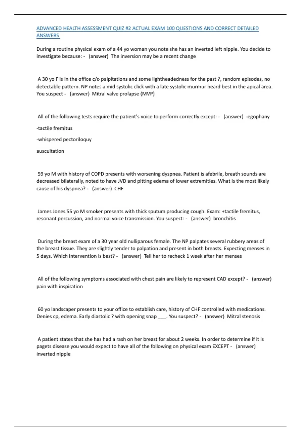 ADVANCED HEALTH ASSESSMENT QUIZ #2 ACTUAL EXAM 100 QUESTIONS AND CORRECT DETAILED