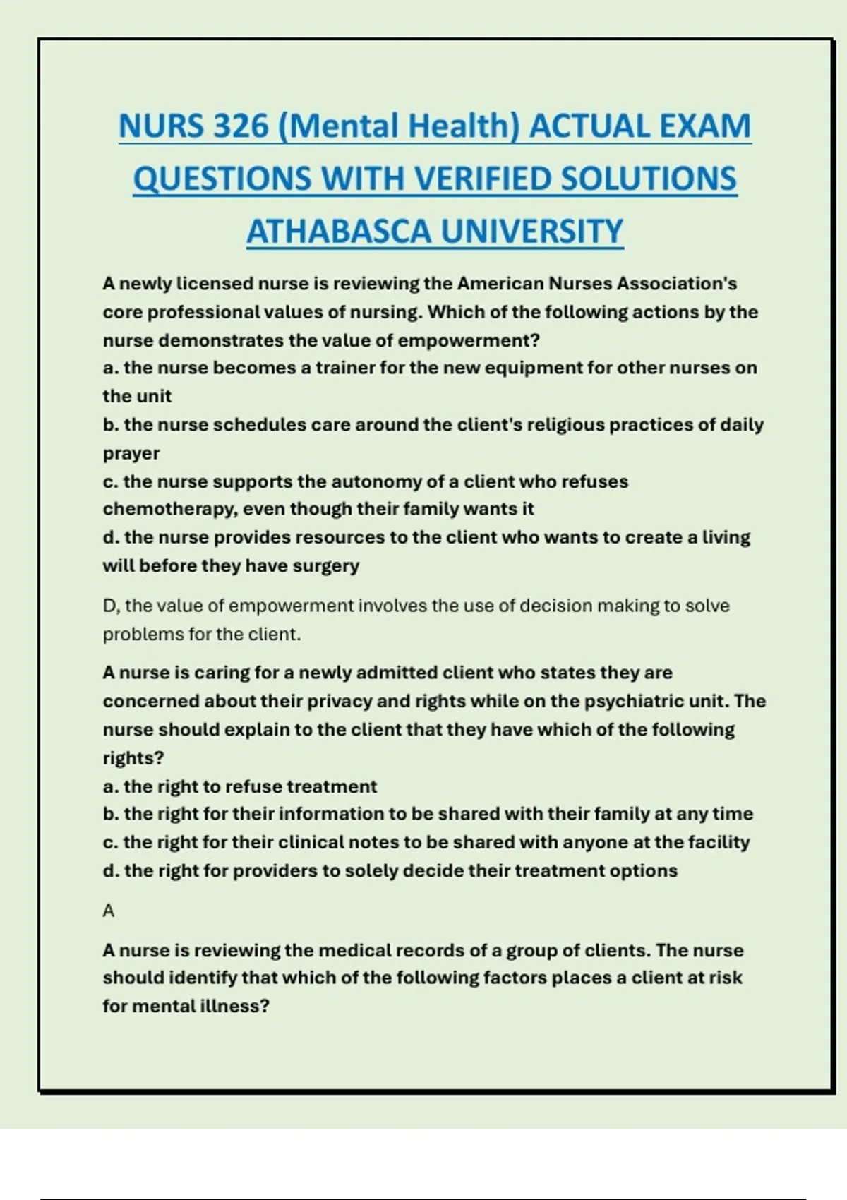 d. the nurse provides resources to the client who wants to create a living