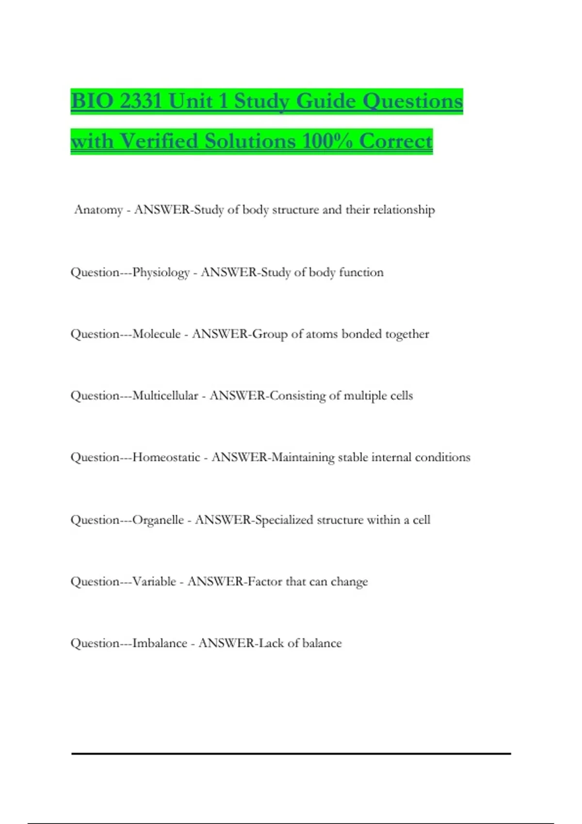 BIO 2331 Unit 1 Study Guide Questions with Verified Solutions 100% Correct