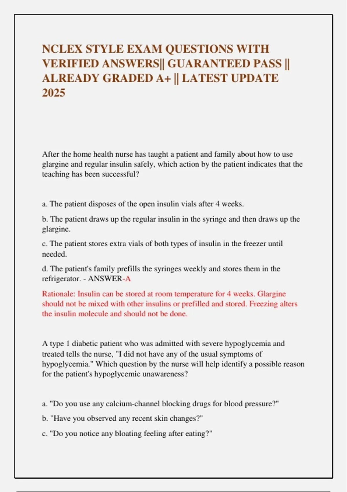 NCLEX STYLE EXAM QUESTIONS WITH VERIFIED ANSWERS|| GUARANTEED PASS || ALREADY GRADED A+ || LATEST UPDATE 2025 After the home health nurse has taught a patient and family about how to use glargine and regular insulin safely, which action by the patient indicates that the teaching has been successful? a. The patient disposes of the open insulin vials after 4 weeks. b. The patient draws up the regular insulin in the syringe and then draws up the glargine. c. The patient stores extra vials of both types of insulin in the freezer until needed. d. The patient's family prefills the syringes weekly and stores them in the refrigerator. - ANSWER-A Rationale: Insulin can be stored at room temperature for 4 weeks. Glargine should not be mixed with other insulins or prefilled and stored. Freezing alters the insulin molecule and should not be done. A type 1 diabetic patient who was admitted with severe hypoglycemia and treated tells the nurse, "I did not have any of the usual symptoms of hypoglycemia." Which question by the nurse will help identify a possible reason for the patient's hypoglycemic unawareness? a. "Do you use any calcium-channel blocking drugs for blood pressure?" b. "Have you observed any recent skin changes?" c. "Do you notice any bloating feeling after eating?" d. "Have you noticed any painful new ulcerations or sores on your feet?" - ANSWER-C Rationale: Hypoglycemic unawareness is caused by autonomic neuropathy, which would also cause delayed gastric emptying. Calcium-channel blockers are not associated with hypoglycemic unawareness, although -adrenergic blockers can prevent patients from having symptoms of hypoglycemia. Skin changes can occur with diabetes, but these are not associated with autonomic neuropathy. If the patient can feel painful areas on the feet, neuropathy has not occurred. A health care provider who has not been immunized for hepatitis B is exposed to the hepatitis B virus (HBV) through a needle stick from an infected patient. The infection control nurse informs the individual that treatment for the exposure should include a. baseline hepatitis B antibody testing now and in 2 months. b. active immunization with hepatitis B vaccine. c. hepatitis B immune globulin (HBIG) injection. d. both the hepatitis B vaccine and HBIG injection. - ANSWER-D Rationale: The recommended treatment for exposure to hepatitis B in unvaccinated individuals is to receive both HBIG and the hepatitis B vaccine, which would provide temporary passive immunity and promote active immunity. Antibody testing may also be done, but this would not provide protection from the exposure. Which of the following persons would most likely be diagnosed with diabetes mellitus? A 44-year-old: a. Caucasian woman. b. Asian woman. c. African-American woman. d. Hispanic male. - ANSWER-c. African-American woman. Age-specific prevalence of diagnosed diabetes mellitus (DM) is higher for African-Americans and Hispanics than for Caucasians. Among those younger than 75, black women had the highest incidence.