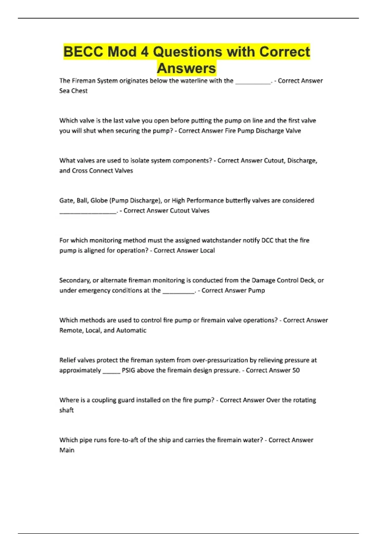 BECC Mod 4 Questions with Correct Answers The Fireman System originates below the waterline with the __________. - Correct Answer Sea Chest Which valve is the last valve you open before putting the pump on line and the first valve you will shut when securing the pump? - Correct Answer Fire Pump Discharge Valve What valves are used to isolate system components? - Correct Answer Cutout, Discharge, and Cross Connect Valves Gate, Ball, Globe (Pump Discharge), or High Performance butterfly valves are considered ________________. - Correct Answer Cutout Valves For which monitoring method must the assigned watchstander notify DCC that the fire pump is aligned for operation? - Correct Answer Local Secondary, or alternate fireman monitoring is conducted from the Damage Control Deck, or under emergency conditions at the _________. - Correct Answer Pump Which methods are used to control fire pump or firemain valve operations? - Correct Answer Remote, Local, and Automatic Relief valves protect the fireman system from over-pressurization by relieving pressure at approximately _____ PSIG above the firemain design pressure. - Correct Answer 50 Where is a coupling guard installed on the fire pump? - Correct Answer Over the rotating shaft Which pipe runs fore-to-aft of the ship and carries the firemain water? - Correct Answer Main
