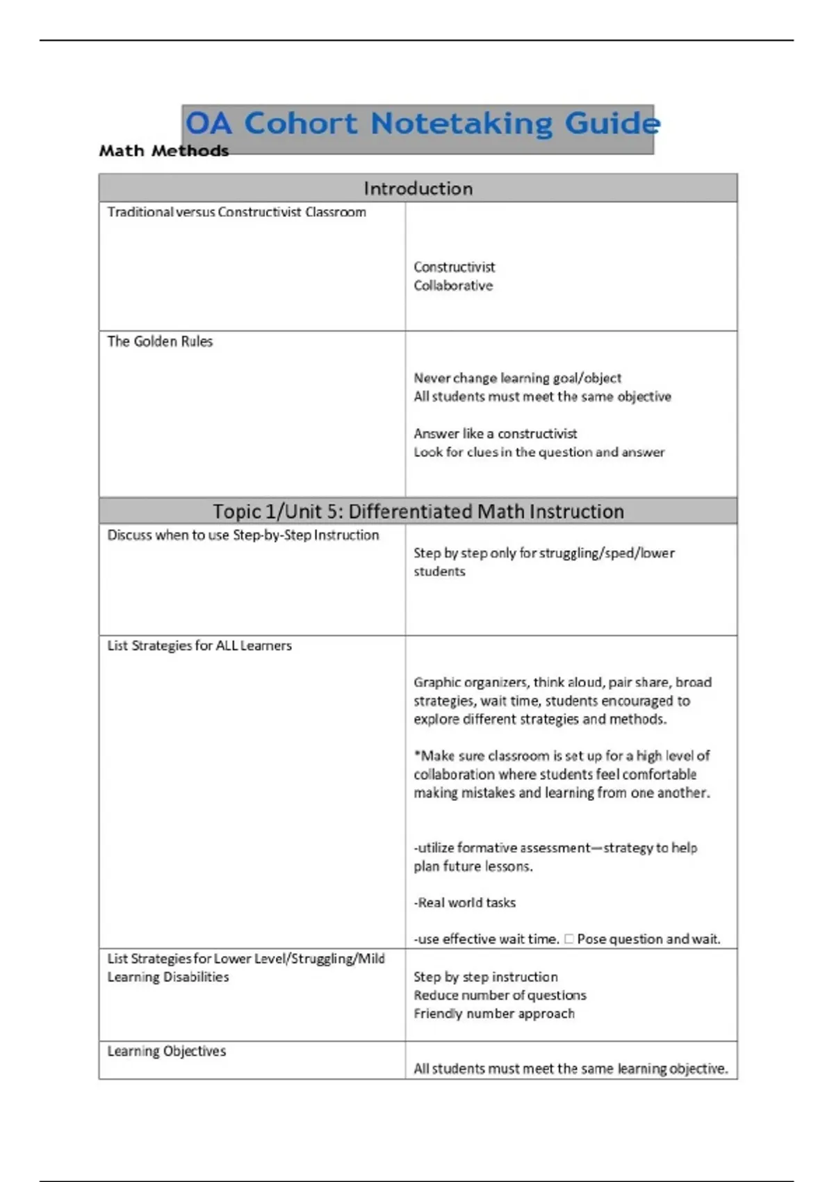 Summary WGU D692 Math Methods OA Cohort Note Taking Guide for Differentiated Instruction | 2025/2026 Update with complete solutions.