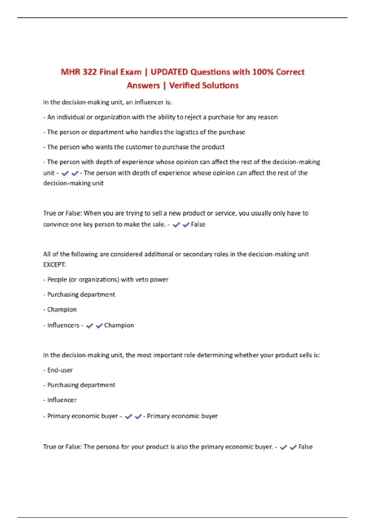 MHR 322 Final Exam | UPDATED Questions with 100% Correct Answers | Verified Solutions