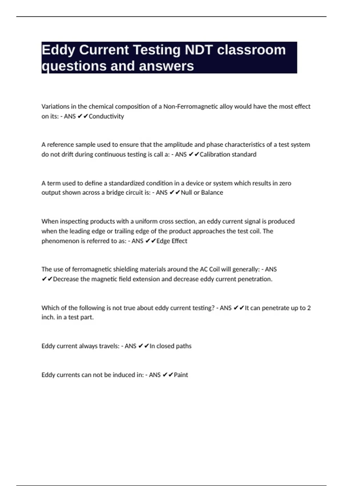 An eddy current system is least sensitive to discontinuities that: - ANS ✔✔Are in the same plane