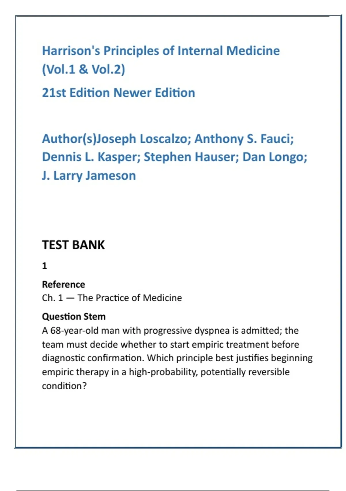 Harrison’s Principles of Internal Medicine 21st Edition Test Bank | Full Vol. 1 & 2 | 20 MCQs per Chapter with Answers & Rationales Description: Master Internal Medicine with the most comprehensive Harrison’s Principles of Internal Medicine (21st Edition) Digital Test Bank — expertly designed for medical, nursing, and healthcare students preparing for NCLEX, HESI, USMLE, or internal medicine board exams. Covering every chapter from both Volume 1 and Volume 2, this premium resource includes 20 meticulously crafted NCLEX/HESI-style multiple-choice questions per chapter, each with correct answers and verified rationales based on Harrison’s 21st Edition. Every question tests real-world clinical reasoning — from diagnosis and pathophysiology to patient safety and evidence-based management. Built by internal medicine educators and exam specialists, this test bank helps you: Strengthen diagnostic reasoning and differential analysis skills Master high-yield pathophysiology and disease mechanisms Prepare confidently for nursing, medicine, and allied health exams Study smarter with immediate answer feedback and rationales Reinforce learning through applied clinical questions Product Features: • 100% coverage of all Harrison’s 21st Edition chapters • 20 high-quality MCQs per chapter (with rationales) • NCLEX, HESI, and USMLE-aligned clinical reasoning items • Instant digital access — organized, searchable, and printable • Trusted academic source for internal medicine mastery Transform your study strategy with a resource trusted by top students and educators worldwide. Master the gold standard of internal medicine — question by question. Keywords: Harrison’s 21st edition test bank Internal medicine test bank Harrison’s Principles of Internal Medicine MCQs Medical exam question bank NCLEX HESI internal medicine practice USMLE internal medicine prep Harrison’s rationales and answers Comprehensive internal medicine review Hashtags: #HarrisonsTestBank #InternalMedicineReview #NCLEXPrep #HESIPractice #MedicalEducation #USMLEStep2 #NursingTestBank #ClinicalReasoning #MedStudentResources #Harrisons21stEdition