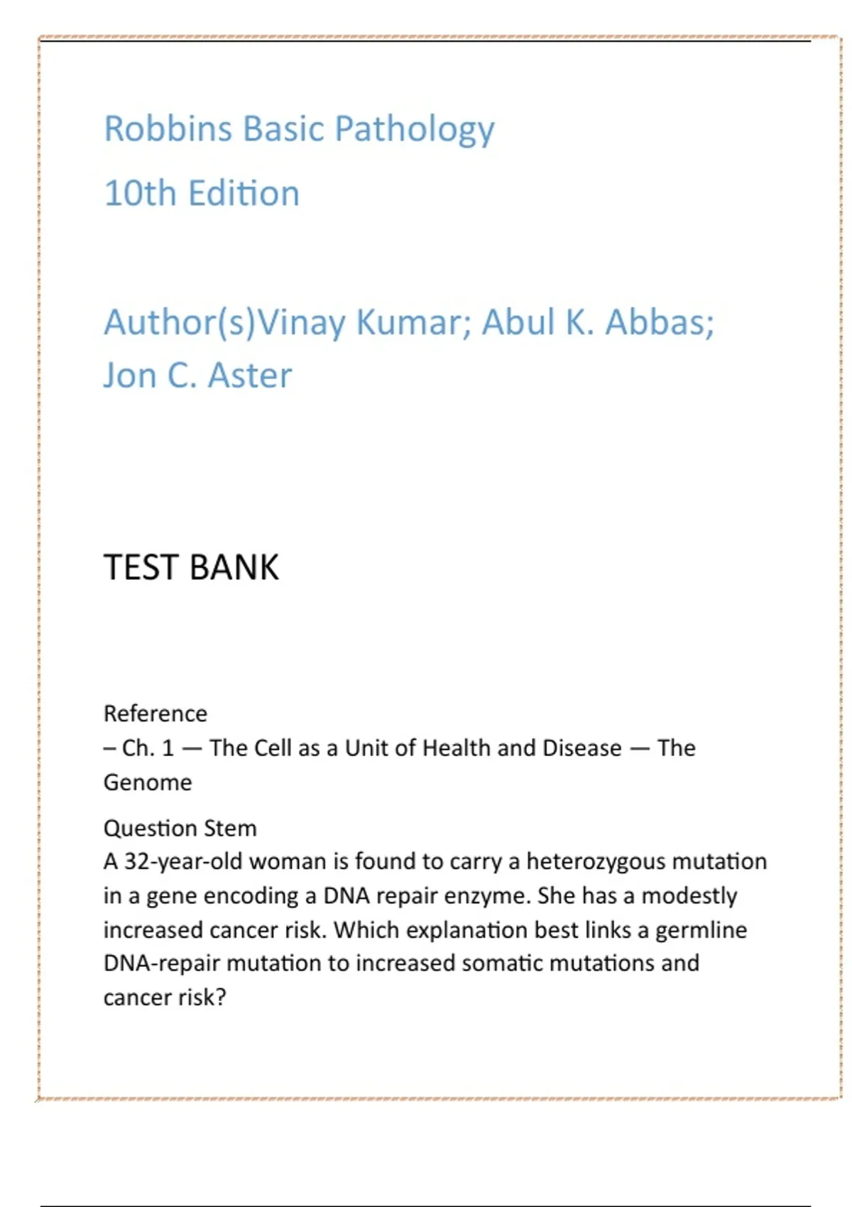 Robbins Basic Pathology 10th Ed Test Bank — Full-Text Coverage, 20 MCQs/Chapter with Answers & Verified Rationales (NCLEX, USMLE, HESI)