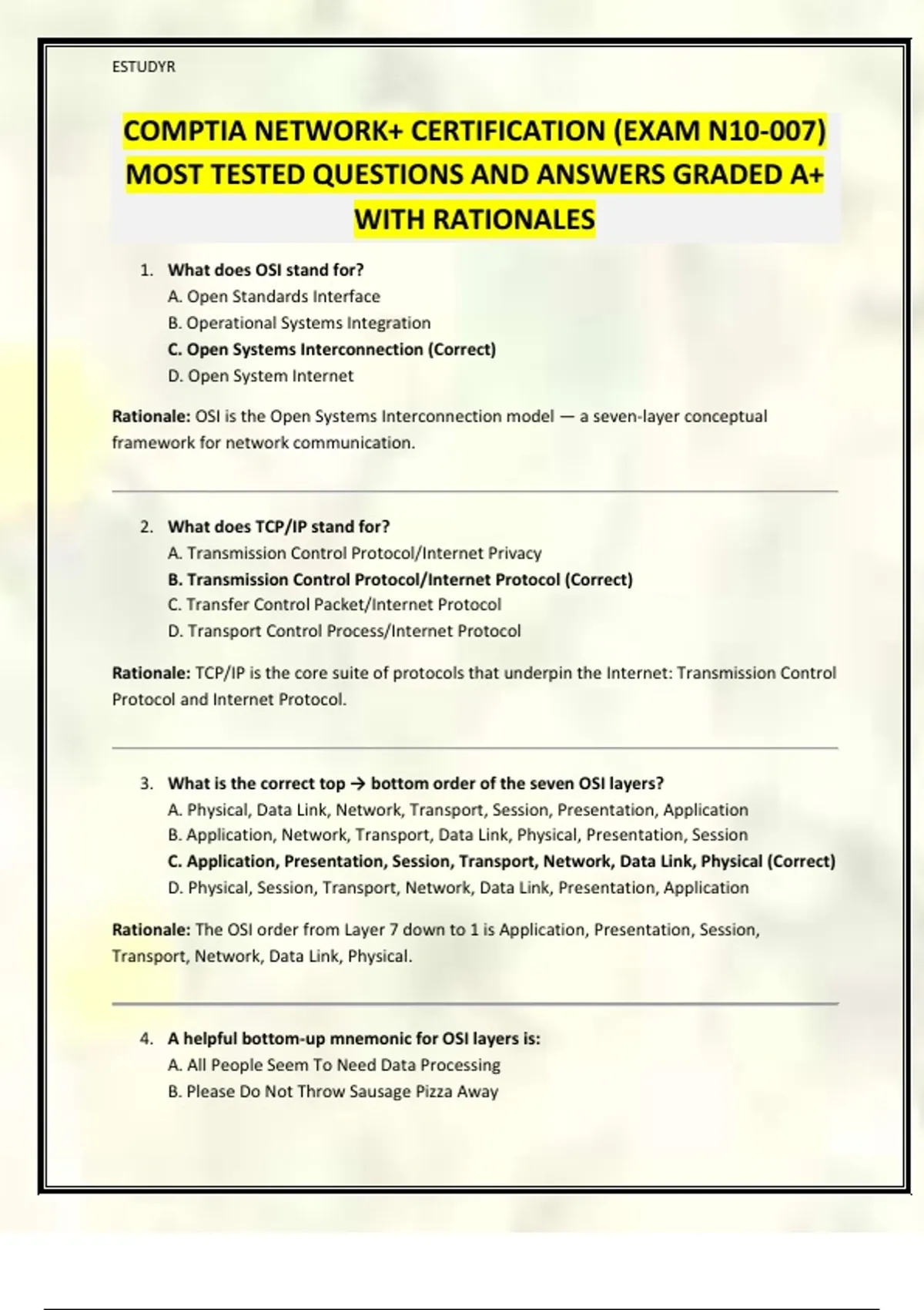 COMPTIA NETWORK+ CERTIFICATION (EXAM N10-007) MOST TESTED QUESTIONS AND ANSWERS GRADED A+ WITH RATIONALES