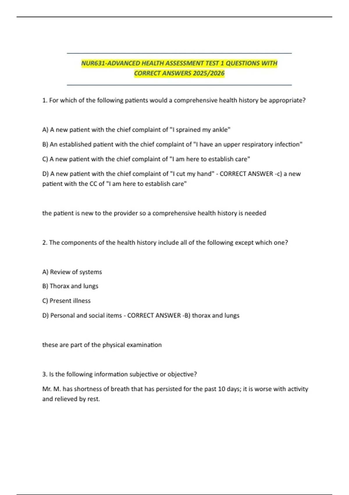 NUR631-ADVANCED HEALTH ASSESSMENT TEST 1 QUESTIONS WITH