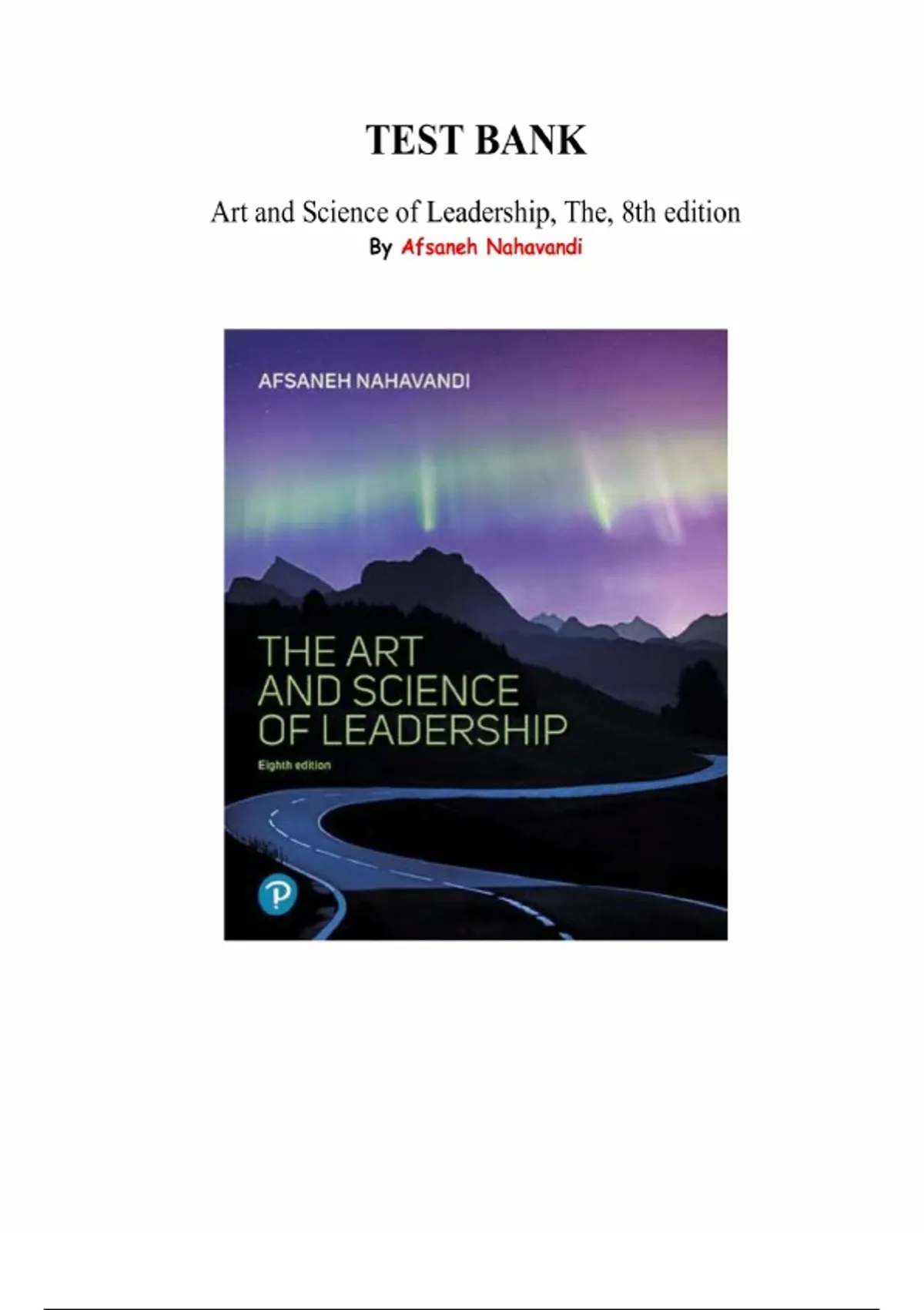 The Art and Science of Leadership (8th Edition) – Afsaneh Nahavandi – Complete Test Bank (Chapters 1–10)..1.Leading in a Turbulent World: Definitions and a Roadmap, 2.Foundations of Modern Leadership, 3.Leading with a Cultural Mindset: Cultural Diversity, 4.Leading with a Cultural Mindset: A Global World, 5.Self-awareness and Perception as the Cornerstones of Effective Leadership, 6.Power and Ethical Leadership, 7.Current Leadership Theories: The Neo-charismatic Era, 8.Participative Leadership and Leading Teams, 9. Leading Change, 10. Developing and Flourishing as a Leader: Implementing the TKD Roadmap