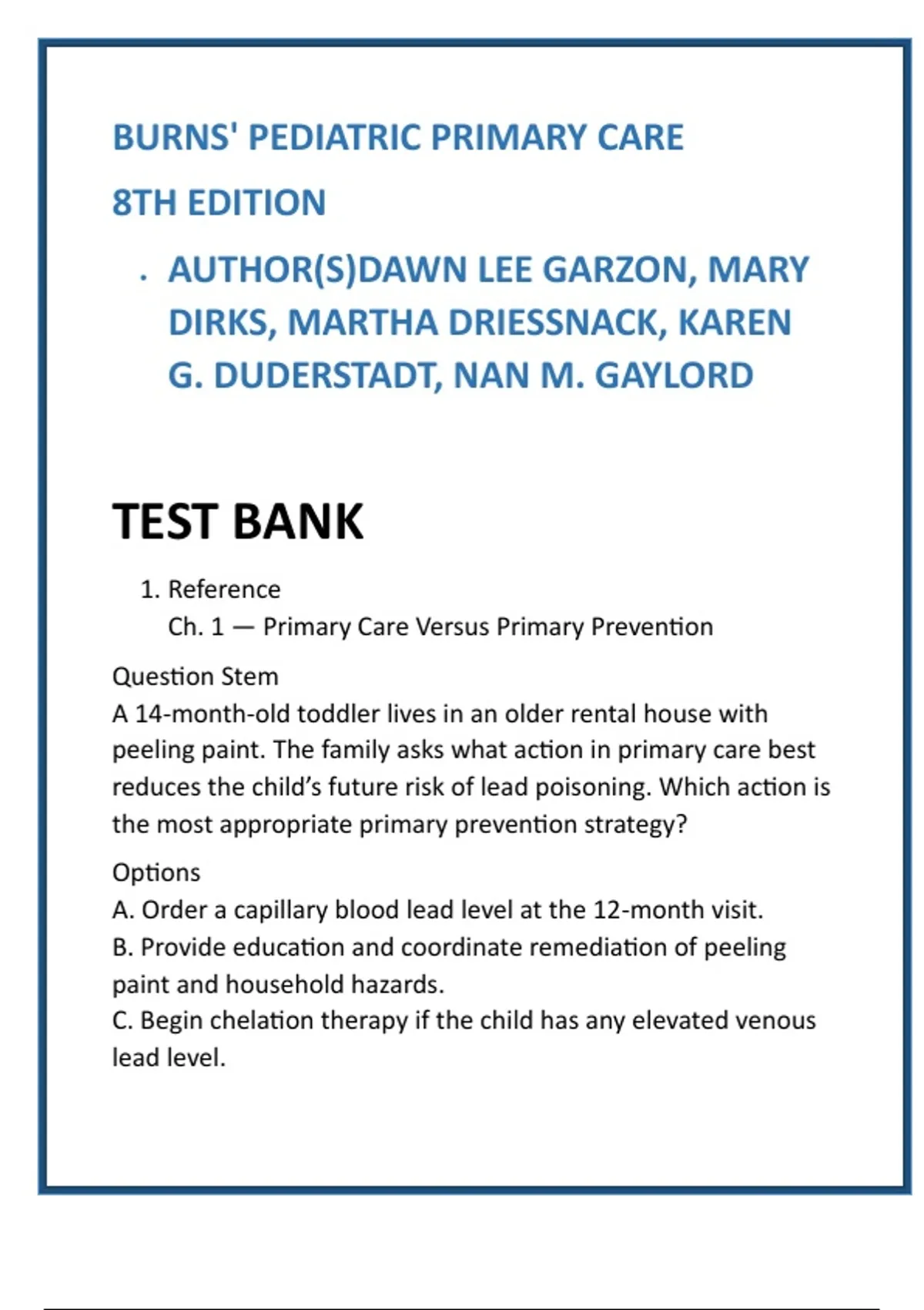 Burns’ Pediatric Primary Care 8th Ed Test Bank — Full-Chapter Coverage, 20 MCQs/Chapter | PNP • FNP • NCLEX Prep Description: Master pediatric primary care with the definitive digital test bank built from Burns’ Pediatric Primary Care — 8th Edition. This comprehensive, exam-focused resource delivers FULL textbook coverage with 20 clinically realistic, evidence-based multiple-choice questions per chapter — each item paired with the correct answer and expert-verified rationale. Designed for Pediatric Nurse Practitioners (PNP), Family Nurse Practitioners (FNP), DNP candidates, and NCLEX/advanced practice exam takers, the test bank turns complex pediatric pathophysiology and family-centered care into high-yield practice that builds clinical judgment, prioritization skills, and exam confidence. Save study time with structured, chapter-aligned practice that mirrors real-world primary care scenarios and the 2025 NCLEX-style cognitive demands. Use for timed practice, targeted remediation, course review, or clinical precepting to boost scores and clinical readiness. Features: – Complete coverage: ALL chapters from Burns’ Pediatric Primary Care, 8th Edition. – 20 original NCLEX/HESI-style MCQs per chapter (application → analysis → evaluation). – Correct answers + expert rationales for every item to enhance learning. – Clinically realistic stems emphasizing pediatrics, family-centered care, and safety. – Ready-to-use for PNP/FNP/DNP exam prep, NCLEX review, course test banks, and clinical teaching. – Downloadable digital format for instant access and flexible study. Trust Burns’ reputation as the gold standard in pediatric primary care—and get a test bank engineered to convert textbook knowledge into exam success and confident clinical decision-making. Keywords: Burns Pediatric Primary Care test bank Burns 8th edition test bank pediatric nursing MCQs PNP exam prep FNP pediatric review NCLEX pediatric practice questions pediatric primary care questions evidence-based pediatric test bank Hashtags: #BurnsPediatricPrimaryCare #PediatricNursing #TestBank #PNPPrep #FNPStudy #NCLEXPrep #PediatricsMCQs #NursingEducation #ClinicalReasoning #8thEdition