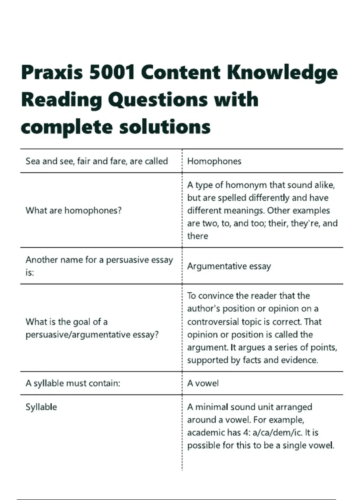 Praxis 5001 Content Knowledge Reading Questions with complete solutions