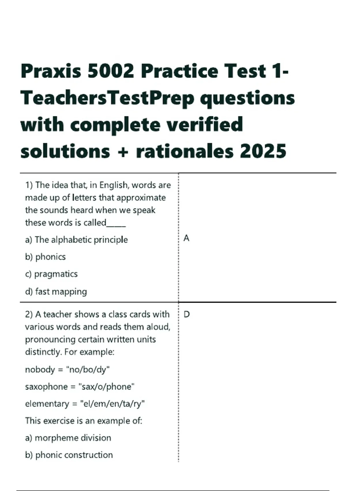 Praxis 5002 Practice Test 1-TeachersTestPrep questions with complete verified solutions +