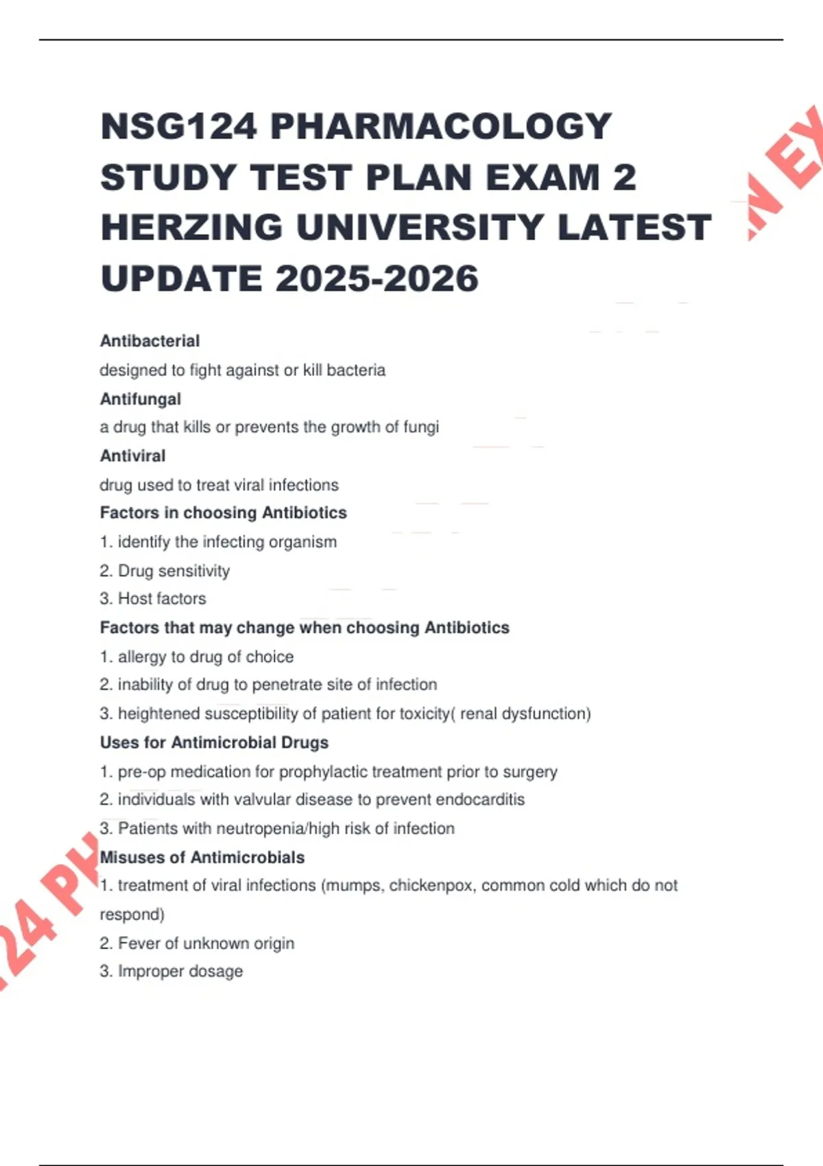 NSG124 PHARMACOLOGY STUDY TEST PLAN EXAM 2 HERZING UNIVERSITY LATEST UPDATE Antibacterial designed to fight against or kill bacteria Antifungal a drug that kills or prevents the growth of fungi Antiviral drug used to treat viral infections Factors in choosing Antibiotics 1. identify the infecting organism 2. Drug sensitivity 3. Host factors Factors that may change when choosing Antibiotics 1. allergy to drug of choice 2. inability of drug to penetrate site of infection 3. heightened susceptibility of patient for toxicity( renal dysfunction) Uses for Antimicrobial Drugs 1. pre-op medication for prophylactic treatment prior to surgery 2. individuals with valvular disease to prevent endocarditis 3. Patients with neutropenia/high risk of infection Misuses of Antimicrobials 1. treatment of viral infections (mumps, chickenpox, common cold which do not respond) 2. Fever of unknown origin 3. Improper dosage