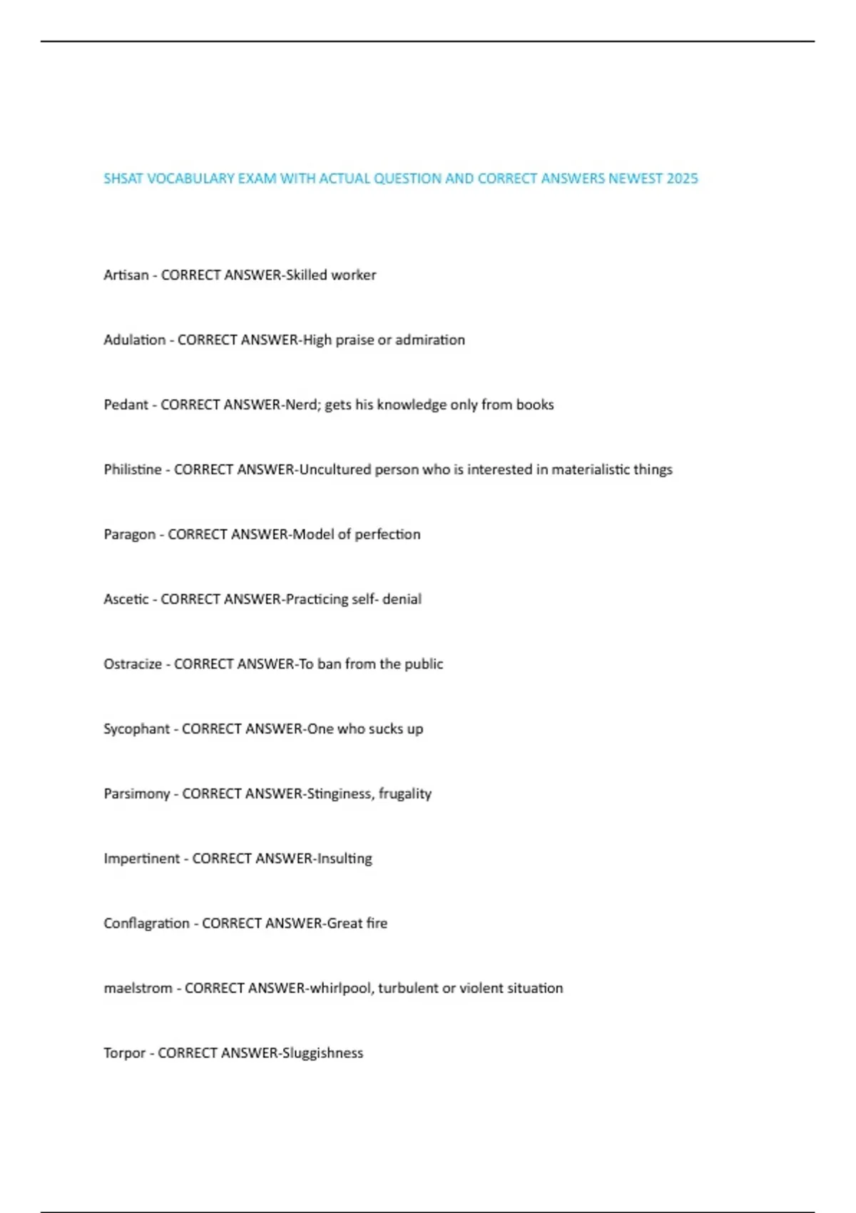 SHSAT VOCABULARY EXAM WITH ACTUAL QUESTION AND CORRECT ANSWERS NEWEST 2025