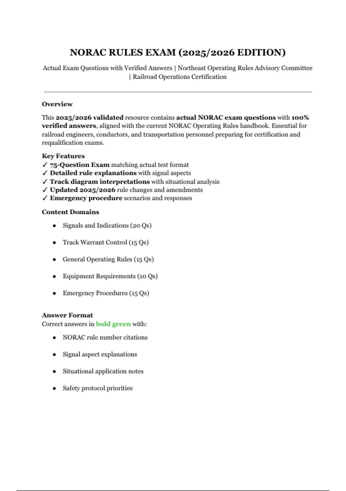 This document includes the verified and updated 2025/2026 edition of the NORAC Rules Exam, containing actual exam-style questions with correct and verified answers. It covers all key topics required for railroad operations certification, including operating procedures, signal rules, dispatcher communication, train movement authority, and safety compliance. Aligned with the official NORAC rulebook, this comprehensive study resource ensures complete preparation for certification and operational proficiency in railroad environments.