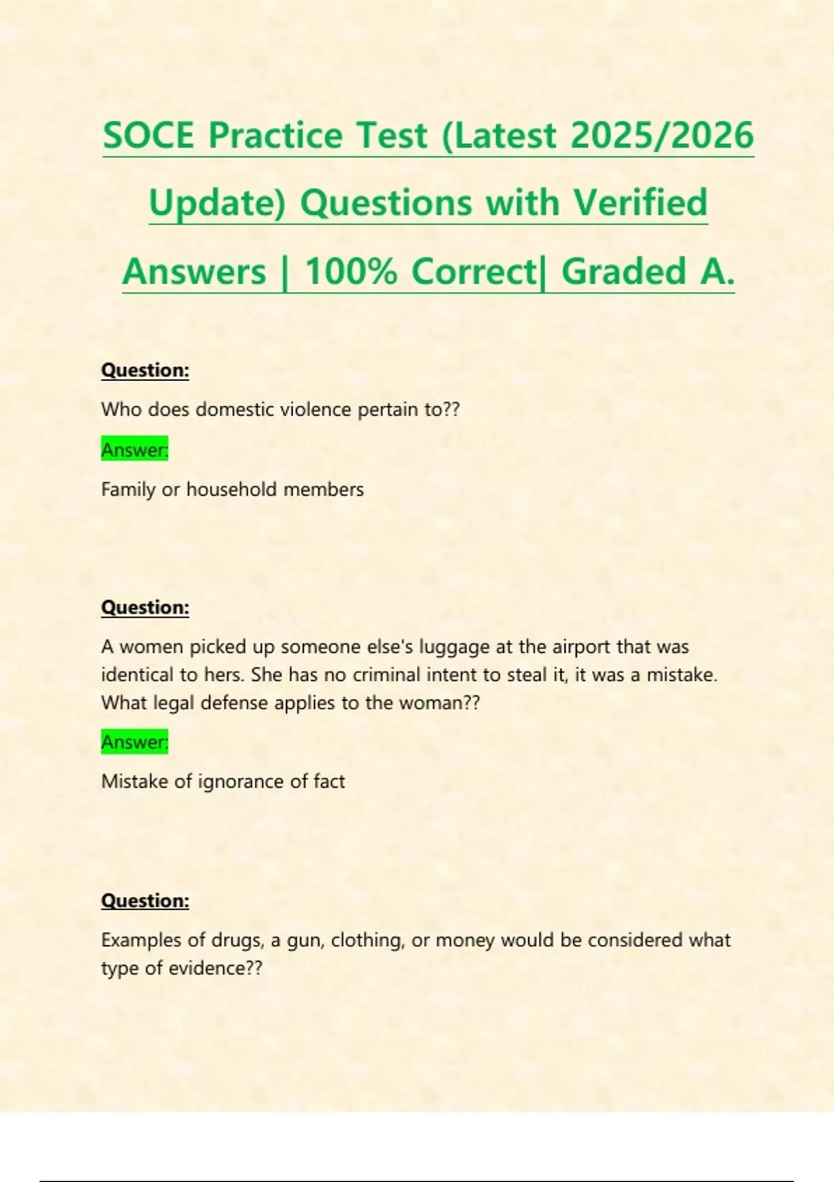 SOCE Practice Test (Latest 2025/2026 Update) Questions with Verified Answers | 100% Correct| Graded A. SOCE Practice Test (Latest 2025/2026 Update) Questions with Verified Answers | 100% Correct| Graded A.