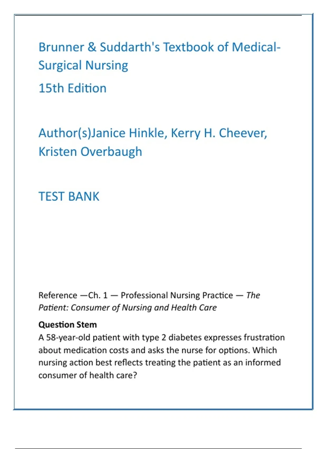 Brunner & Suddarth’s Medical-Surgical Nursing Test Bank 15th Edition | NCLEX & HESI Prep | Complete Med-Surg Question Bank Description: This comprehensive Medical-Surgical Nursing Test Bank is built exclusively from Brunner & Suddarth’s Textbook of Medical-Surgical Nursing, 15th Edition (newer edition available) — the gold-standard authority in global adult med-surg nursing practice. Designed for students who are serious about mastery, this fully developed digital test bank delivers exam-ready content that accelerates clinical comprehension, sharpens diagnostic reasoning, and drives high-performance outcomes on the NCLEX-RN, HESI, ATI, and advanced nursing school med-surg examinations. Every chapter of Brunner & Suddarth is covered, with 20 NCLEX/HESI-style multiple-choice questions per chapter — each accompanied by correct answers and clear, evidence-based rationales. This format is engineered to train active clinical thinking, rapid prioritization, therapeutic decision making, and safe, outcome-focused nursing judgment aligned with the 2025 NCLEX-RN Test Plan. Included Features: • Full coverage of ALL chapters (complete med-surg system mastery) • 20 NCLEX/HESI-style MCQs per chapter • Correct answers + referenced rationales for every question • Nursing Process integrated in every item (ADPIE) • Focused on pathophysiology, priority care, and patient safety • Evidence-based, clinically optimized, and exam performance-driven • Saves hundreds of study hours while boosting test accuracy and confidence Perfect for nursing students, nurse educators, remediation planning, NCLEX prep bootcamps, tutoring programs, and clinical reasoning curriculum usage. Keywords: medical-surgical nursing test bank Brunner & Suddarth NCLEX questions 15th edition med-surg test bank HESI med-surg prep NCLEX RN medical surgical bank evidence-based nursing rationales nursing school exam prep adult med-surg NCLEX review Hashtags: #nclexprep #brunnerandsuddarth #medsurgtestbank #medicalsurgicalnursing #nclexrn #hesiprep #atiprep #pathophysiology #nursingschool #criticalthinking
