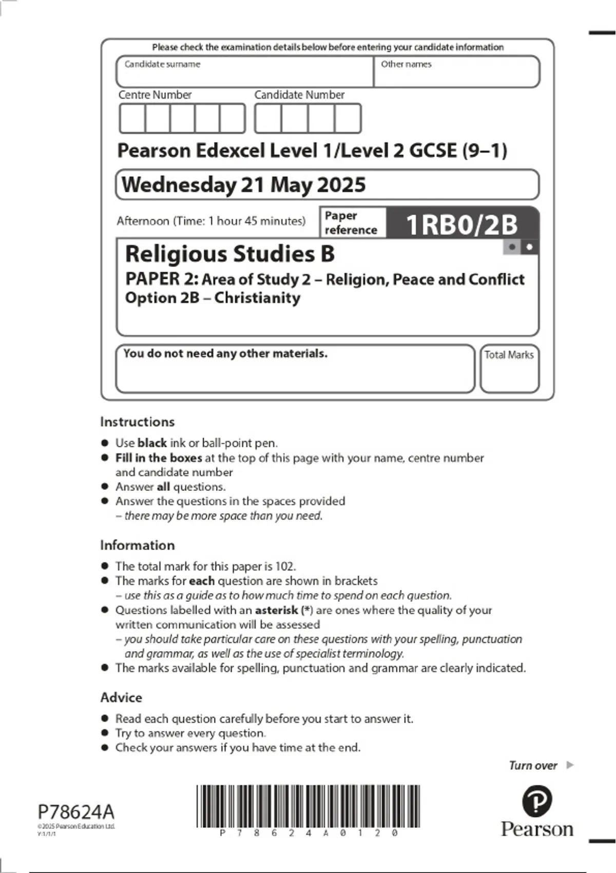 2025 Pearson Edexcel Level 1/Level 2 GCSE (9–1) Religious Studies B PAPER 2: Area of Study 2 – Religion, Peace and Conflict Option 2B – Christianity Combined Question Paper &Final Marking Scheme