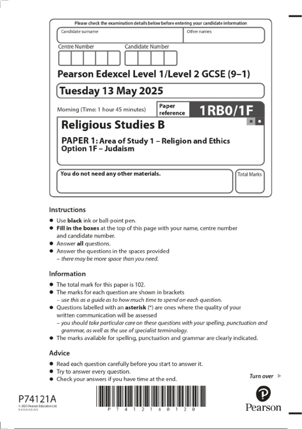 2025 Pearson Edexcel Level 1/Level 2 GCSE (9–1) Religious Studies B PAPER 1: Area of Study 1 – Religion and Ethics Option 1F – Judaism Combined Question Paper &Final Marking Scheme