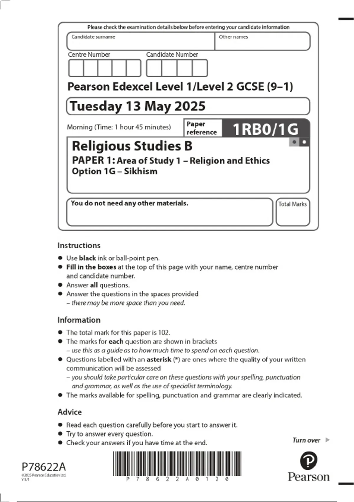 2025 Pearson Edexcel Level 1/Level 2 GCSE (9–1) Religious Studies B PAPER 1: Area of Study 1 – Religion and Ethics Option 1G – Sikhism Combined Question Paper &Final Marking Scheme