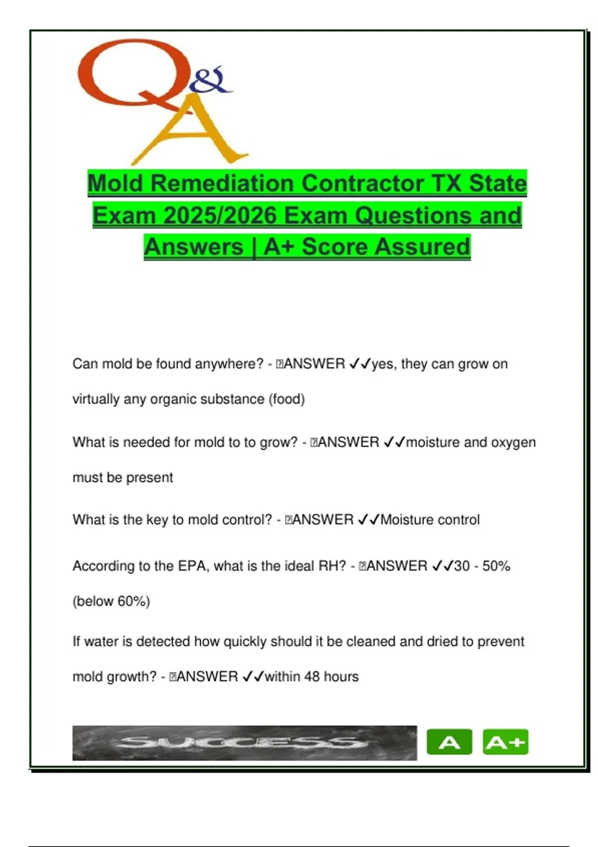 This document is a comprehensive exam preparation guide featuring 150 verified questions and answers for the Mold Remediation Contractor (MRC) licensing exam under the Texas Mold Assessment and Remediation Rules (TMARR). Tailored specifically for 2025/2026 standards, it integrates federal guidance from the EPA and OSHA, making it an essential resource for individuals pursuing licensure in mold remediation in Texas. The document provides complete coverage of critical exam topics including: – Legal definitions and compliance obligations under TMARR – Mold remediation protocols and work plan development – Proper use and requirements for PPE (e.g., N-95, PAPR) – Containment classifications (limited vs. full), setup, and air pressure control – Health effects of mold exposure, including mycotoxins, mVOCs, and hypersensitivity syndromes – Air sampling procedures, HEPA filtration, and clearance assessments – Penalties and violation classifications (critical, serious, significant) – Training, registration, and licensing requirements for contractors and workers – Mold clean-up techniques by surface type and contamination level This guide is designed for students, professionals, and trainees preparing for the Mold Remediation Contractor exam, and is particularly valuable for individuals studying or working in the following fields: – Environmental Health & Safety (EHS) – Industrial Hygiene & Occupational Health – Environmental Science & Technology – Construction Safety & Compliance – Building Inspection & Restoration – Public Health Programs focused on Indoor Air Quality It is especially useful for students enrolled at institutions such as Texas State University, Texas A&M, University of Texas, or those taking state-accredited licensing prep courses. Whether used for structured study or last-minute review, this document ensures clear, direct access to the knowledge required to pass the MRC state exam with confidence. Keywords: Mold Remediation Contractor, Texas TMARR, mold exam 2025, mold remediation questions, EPA mold guidelines, OSHA mold standards, containment procedures, mold protocol, PPE requirements, HEPA filter, mold violations Texas, air sampling mold, toxigenic molds, indoor mold regulations, TMARR penalties, CMIS, mold training Texas, MRC exam prep, mold remediation work plan, environmental licensing, clearance criteria