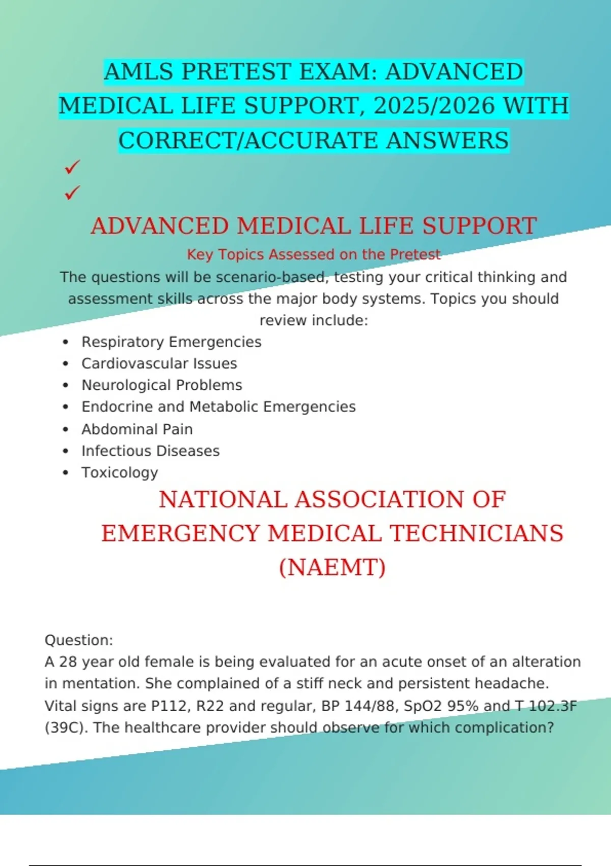AMLS PRETEST EXAM: ADVANCED MEDICAL LIFE SUPPORT, 2025/2026 WITH CORRECT/ACCURATE ANSWERS
