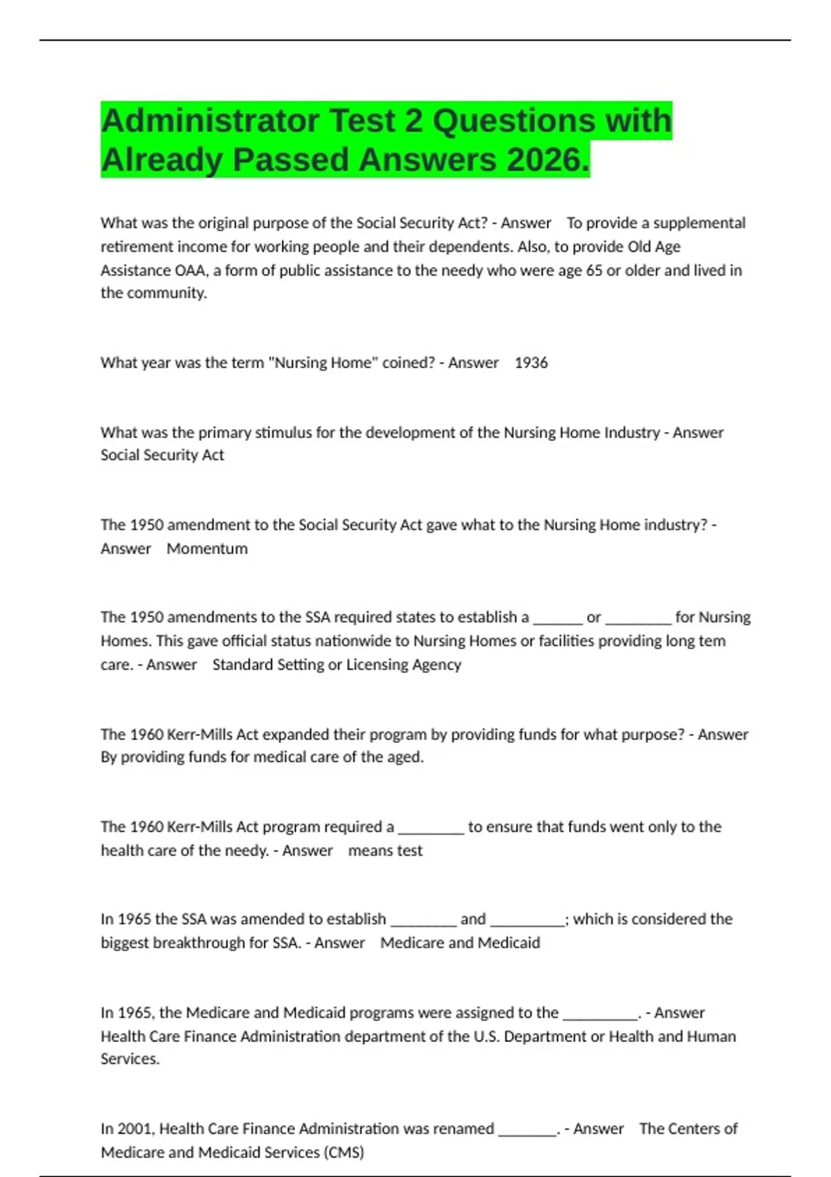 What was the original purpose of the Social Security Act? - Answer To provide a supplemental retirement income for working people and their dependents. Also, to provide Old Age Assistance OAA, a form of public assistance to the needy who were age 65 or older and lived in the community. What year was the term "Nursing Home" coined? - Answer 1936 What was the primary stimulus for the development of the Nursing Home Industry - Answer Social Security Act The 1950 amendment to the Social Security Act gave what to the Nursing Home industry? - Answer Momentum The 1950 amendments to the SSA required states to establish a ______ or ________ for Nursing Homes. This gave official status nationwide to Nursing Homes or facilities providing long tem care. - Answer Standard Setting or Licensing Agency The 1960 Kerr-Mills Act expanded their program by providing funds for what purpose? - Answer By providing funds for medical care of the aged. The 1960 Kerr-Mills Act program required a ________ to ensure that funds went only to the health care of the needy. - Answer means test In 1965 the SSA was amended to establish ________ and _________; which is considered the biggest breakthrough for SSA. - Answer Medicare and Medicaid In 1965, the Medicare and Medicaid programs were assigned to the _________. - Answer Health Care Finance Administration department of the U.S. Department or Health and Human Services. In 2001, Health Care Finance Administration was renamed _______. - Answer The Centers of Medicare and Medicaid Services (CMS) CMS determines eligibility for _______. - Answer Medicare