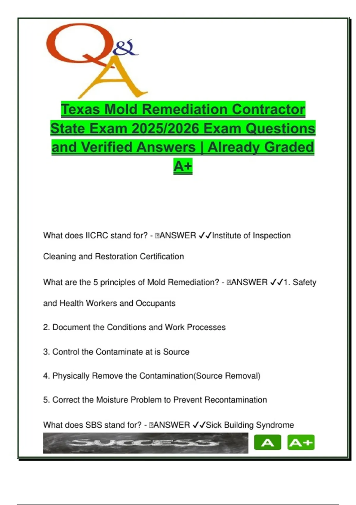 This document is a complete exam preparation guide for the Texas Mold Remediation Contractor State Exam for the 2025/2026 cycle, containing over 100 accurately answered questions. It is aligned with the Texas Department of Licensing and Regulation (TDLR) and the Texas Mold Assessment and Remediation Rules (TMARR), providing essential regulatory knowledge and field practices. Key topics include mold remediation protocols, health effects of mold exposure, licensing and renewal fees, notice and documentation requirements, containment strategies, PPE standards, Certificate of Mold Damage Remediation (CMDR), and water damage categories. The guide also covers mold types (Stachybotrys, Aspergillus, Fusarium), sampling and clearance processes, emergency notification timelines, and legal definitions like SBS (Sick Building Syndrome) and VOCs (Volatile Organic Compounds). Practical content such as the principles of remediation, required worksite signage, required insurance, and proper decontamination practices makes it a high-value study aid. This resource is ideal for professionals pursuing TDLR licensure as mold remediation contractors in Texas, including environmental consultants, building inspectors, HVAC professionals, and students in vocational or environmental health and safety programs across the state. Keywords: Texas mold exam 2025, TDLR certification, mold remediation contractor, TMARR rules, CMDR, IICRC, SBS, VOC, mycotoxins, PPE requirements, worksite signage, mold clearance, water damage categories, licensing fees, containment protocols, mold health effects