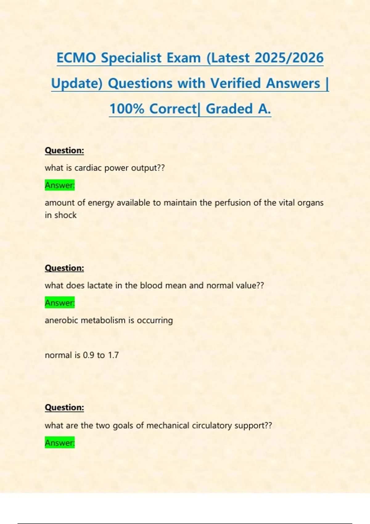 ECMO Specialist Exam (Latest 2025/2026 Update) Questions with Verified Answers | 100% Correct| Graded A.