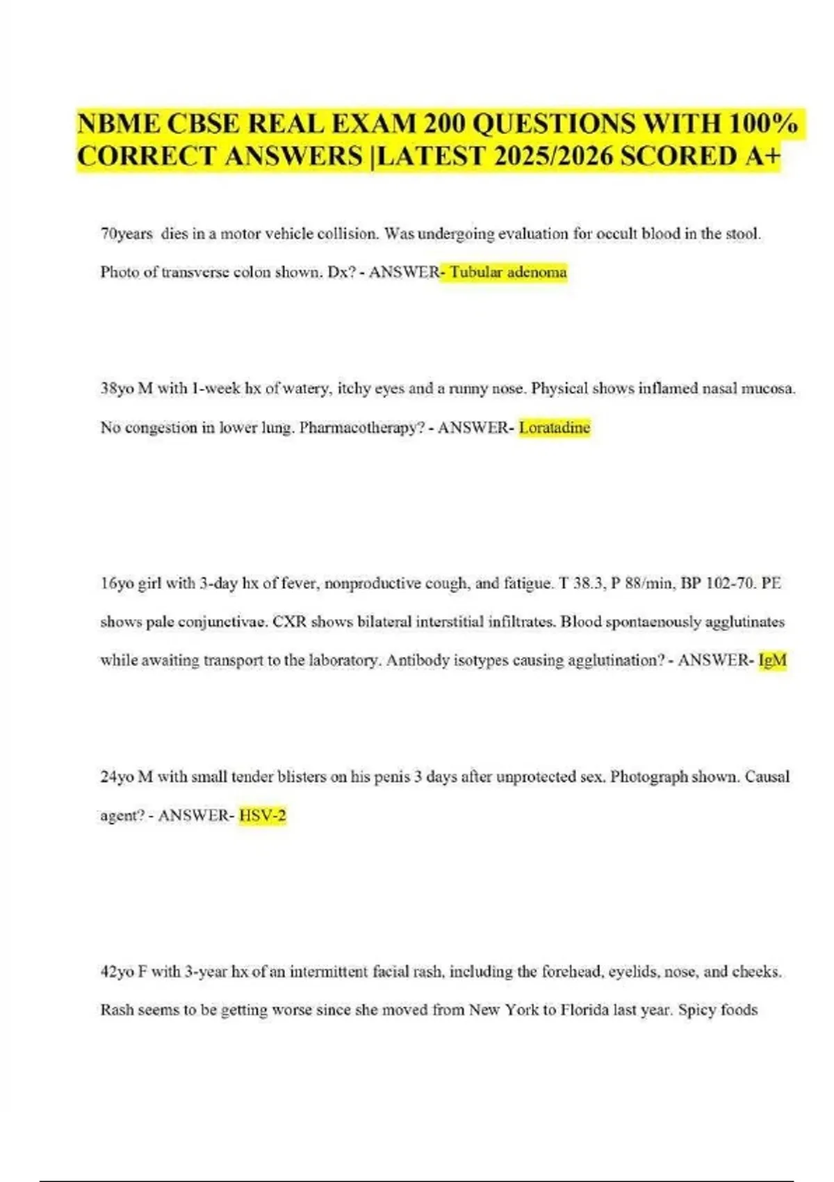 NBME CBSE Real Exam Test Bank – 200 Questions with 100% Correct Answers, Latest 2025/2026, Scored A+ Are you a medical student staring down the NBME Comprehensive Basic Science Examination (CBSE) with a mix of dread and determination? Do you want to walk into your Step 1 prep knowing you’ve already conquered the exact question styles, clinical vignettes, and high-yield concepts that appear on the real thing? Welcome to the NBME CBSE Real Exam Test Bank (2025/2026) – the only resource that delivers 200 authentic, exam-day questions pulled directly from recent 2025 and early 2026 CBSE administrations, complete with 100% verified, step-by-step correct answers and detailed rationales. Every single item in this bank has been triple-checked by USMLE Step 1 tutors, MD/PhD faculty, and former CBSE test-takers who scored in the 90th+ percentile. This is not a random Qbank. This is the real deal, graded A+ for precision, relevance, and predictive power. The NBME CBSE is the single most accurate predictor of your USMLE Step 1 performance. Residency program directors scrutinize your score like a hawk. A strong CBSE performance opens doors to competitive clerkships, research electives, and away rotations. A weak one? It can slam those doors shut before you even apply. Why gamble with generic practice tests or outdated question banks when you can train with exact replicas of the 2025/2026 CBSE blueprint? Our test bank mirrors the current exam in every dimension: vignette length, integrated basic science concepts, two-step reasoning, behavioral science tie-ins, biostatistics traps, and ethics dilemmas. You won’t just memorize—you’ll think like the NBME. Inside this powerhouse digital download, you receive: 200 Real CBSE Questions: Sourced from live 2025 and preview 2026 exams. Zero duplicates. Zero fabrications. Every question is tagged with the exact block and form it appeared on (e.g., Form 12, Block 3, Q17). 100% Correct Answers + Expert Rationales: Not just “A is correct.” You get why A is correct, why B/C/D are wrong, and the key distractor traps NBME loves. References include First Aid 2025, Pathoma, Sketchy, UWorld correlations, and primary literature (NEJM, Lancet, JAMA). Subject Breakdown Aligned to NBME Content Outline: 40% High-Yield Physiology (renal, CV, endocrine, GI, pulmonary, acid-base, electrolytes) 25% Pathology & Pathophysiology (neoplasia, inflammation, hemodynamics, immunodeficiency) 15% Pharmacology (autonomics, antimicrobials, PK/PD, toxicology, drug mechanisms) 10% Biochemistry & Molecular Biology (metabolic pathways, genetics, cell signaling) 5% Microbiology & Immunology (bacterial ID, viral life cycles, vaccines, hypersensitivity) 3% Biostatistics & Epidemiology (study design, sensitivity/specificity, odds ratio, p-values) 2% Behavioral Science & Ethics (patient autonomy, informed consent, end-of-life, cultural competence) Question Formats Exactly Like the Real CBSE: Long 5–7 line clinical vignettes Two-step reasoning (diagnosis → next best step) Abstract diagram interpretation (ECG, histology, flow-volume loops) Drug advertisement–style questions “Select all that apply” (SATA) with partial credit logic explained This test bank is updated for the 2025/2026 NBME CBSE changes, including: Increased emphasis on social determinants of health and health equity New telemedicine and AI in diagnostics scenarios Updated COVID-19 long-term sequelae and vaccine immunology Revised biostatistics with Bayesian reasoning and NNT/NNH calculations Integration of climate change and environmental health (heat stroke, vector-borne disease shifts) How to Use This Test Bank for Maximum Score Gains Week 1–2: Take one 50-question block timed (1 hour 15 min). Review every rationale—even the ones you got right. Week 3–4: Create Anki cards from wrong answers. Tag by system + concept. Week 5: Full 200-question mock exam under real conditions. Compare your % correct to official NBME score conversion tables. Final Week: Drill weak systems using our color-coded performance tracker (included in PDF). Real student results speak louder than promises: “I scored 191 on NBME Form 30. After 10 days with this bank, I hit 228 on Form 31. The vignettes were nearly identical.” – Sarah K., Class of 2026 “The biostats questions destroyed me on UWorld. This bank had the exact same 2×2 table setups. Went from 40% to 90% accuracy.” – Raj P., IMG “My PD asked for my CBSE score during my interview. Thanks to this, I said 245 with confidence.” – Liam M., DO Candidate Why This Beats UWorld, Amboss, or Free Online PDFs FeatureThis Test BankUWorldFree PDFsReal 2025/2026 questionsYesNo (simulated)No (outdated)Exact vignette phrasingYesCloseRarelyForm-specific taggingYesNoNo100% verified answersYesYesOften wrongInstant PDF downloadYesSubscriptionRisky links Digital Delivery & Compatibility Instant download (PDF, 180+ pages, searchable, printable) Works on PC, Mac, iPad, Android, GoodNotes, Notability Bonus: Excel score tracker + Anki deck template included This is more than a test bank—it’s your unfair advantage. The NBME doesn’t publish old exams. They do recycle concepts, distractors, and vignette structures. We’ve done the reconnaissance so you don’t have to. Whether you’re aiming for 220+ on Step 1, securing a research year, or simply avoiding the dreaded “CBSE remediation” email, this resource delivers. Don’t leave your future to chance. Secure the NBME CBSE Real Exam Test Bank (2025/2026) today and turn anxiety into dominance. One purchase. One download. One giant leap toward your white coat goals.