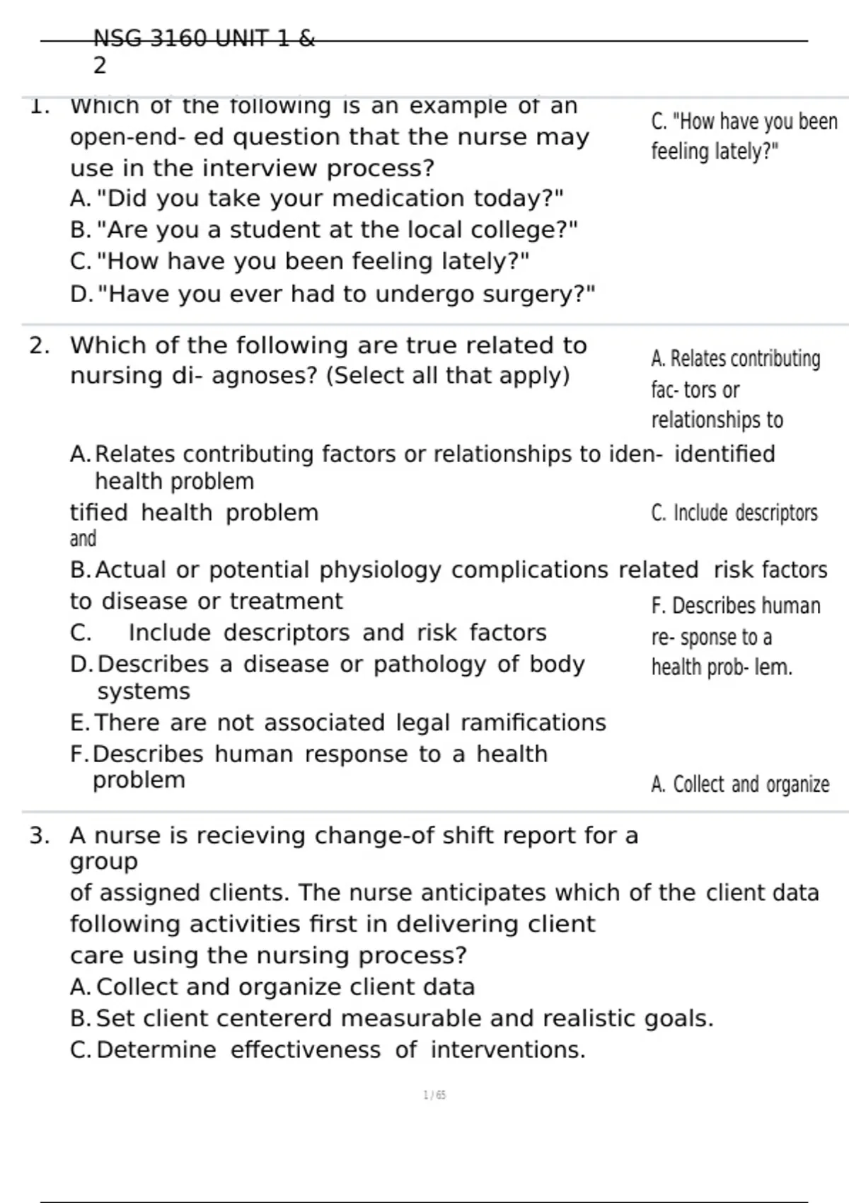 5. A nurse in a clinic is interviewing a client who B. Assessment