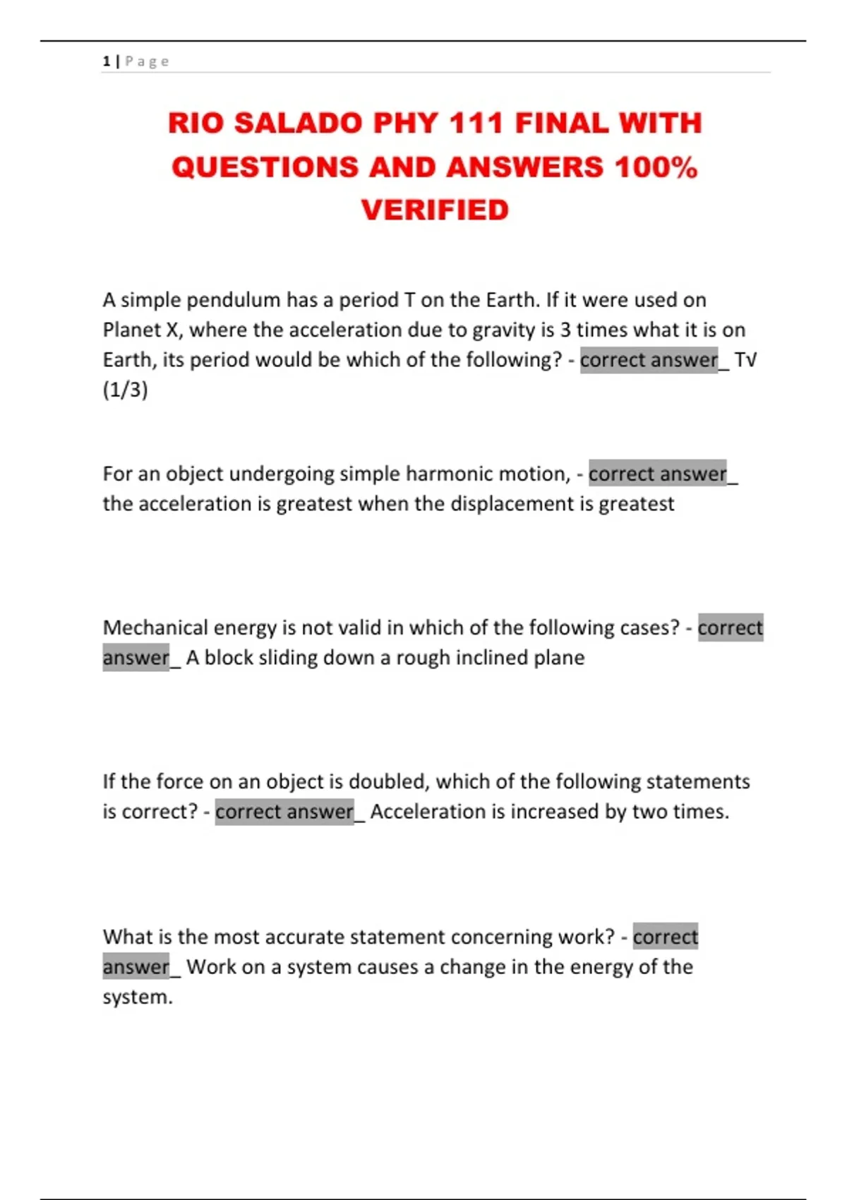 RIO SALADO PHY 111 FINAL WITH QUESTIONS AND ANSWERS 100% VERIFIED