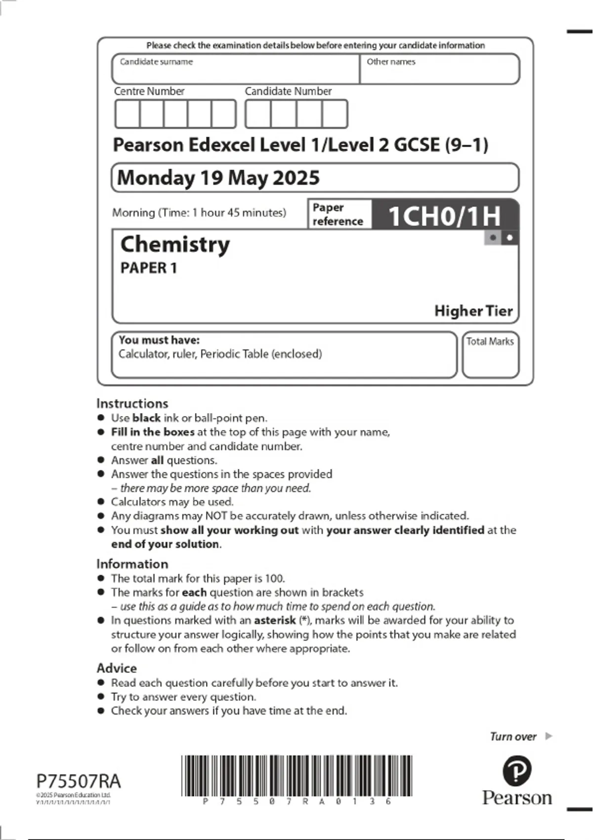 2025 Pearson Edexcel Level 1/Level 2 GCSE (9–1) Chemistry PAPER 1 Higher Tier Combined Question Paper and Final Marking Scheme