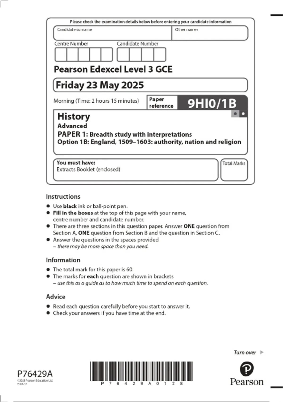 2025 Pearson Edexcel Level 3 GCE History Advanced PAPER 1: Breadth study with interpretations Option 1B: England, 1509–1603: authority, nation and religion Combined Question Paper & Final Marking Scheme