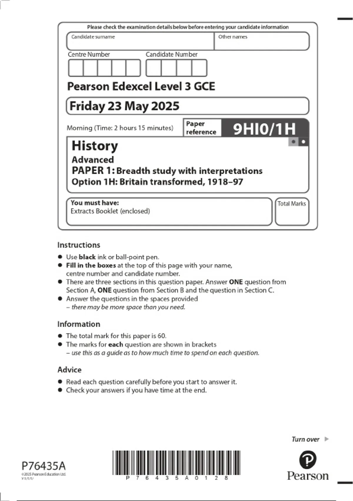 2025 Pearson Edexcel Level 3 GCE History Advanced PAPER 1: Breadth study with interpretations Option 1H: Britain transformed, 1918–97Combined Question Paper & Final Marking Scheme