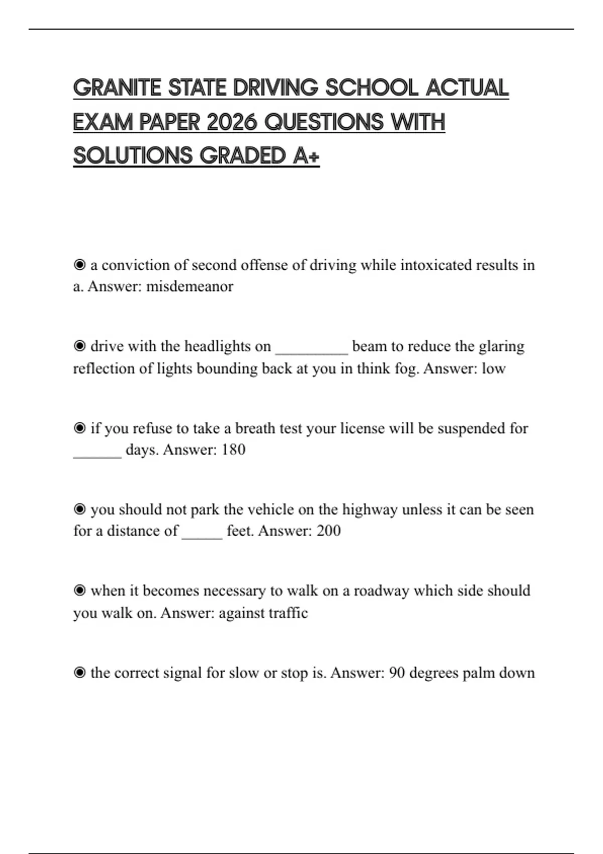 GRANITE STATE DRIVING SCHOOL ACTUAL EXAM PAPER 2026 QUESTIONS WITH SOLUTIONS GRADED A+