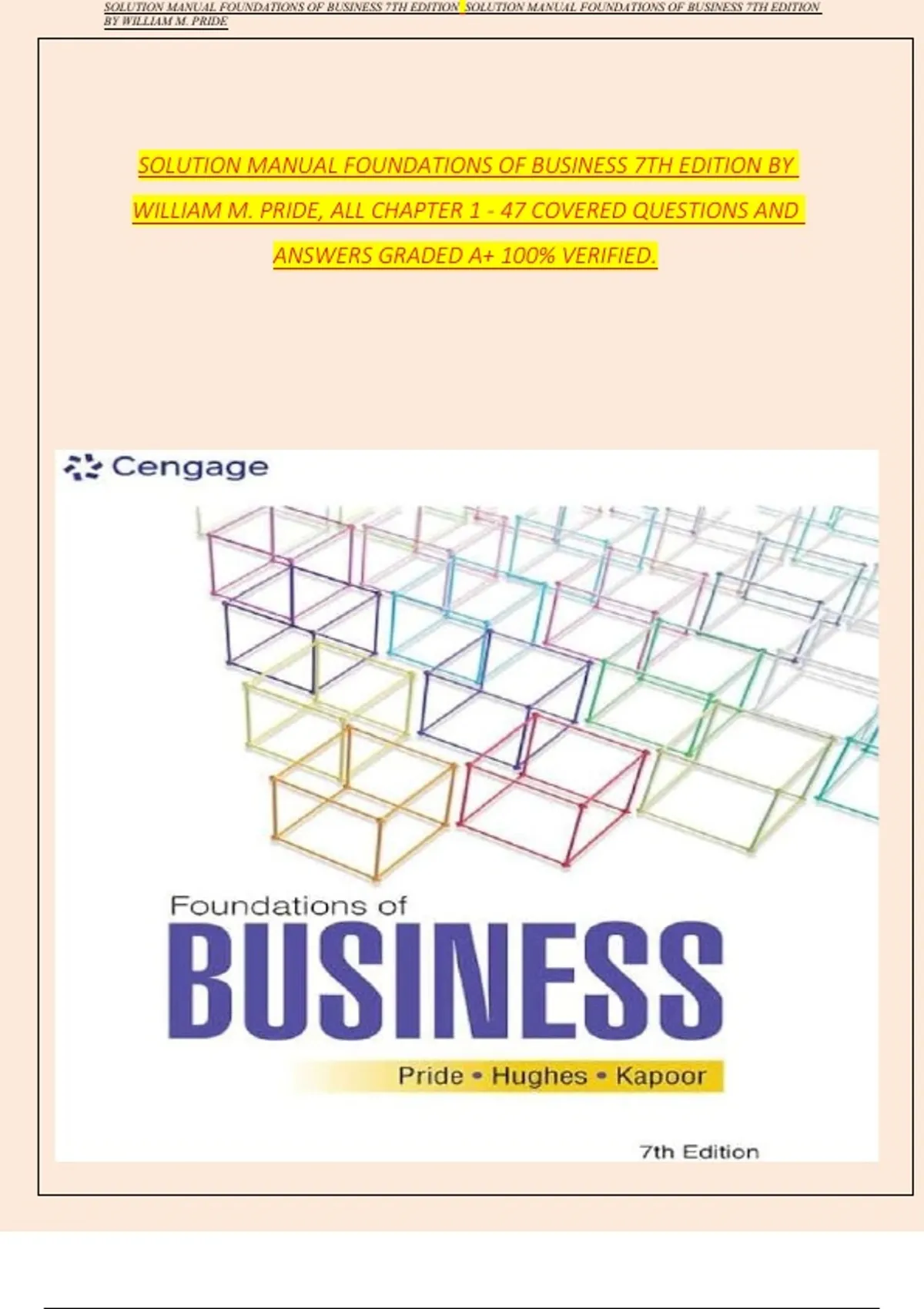 This document provides the complete solution manual for Foundations of Business, 7th Edition by William M. Pride. It includes fully solved questions and step-by-step answers for all chapters (1–47). The material covers essential business concepts such as management, marketing, finance, entrepreneurship, and business ethics. Each solution has been verified for accuracy, making it ideal for study support, exam preparation, and homework assistance in business and management courses.