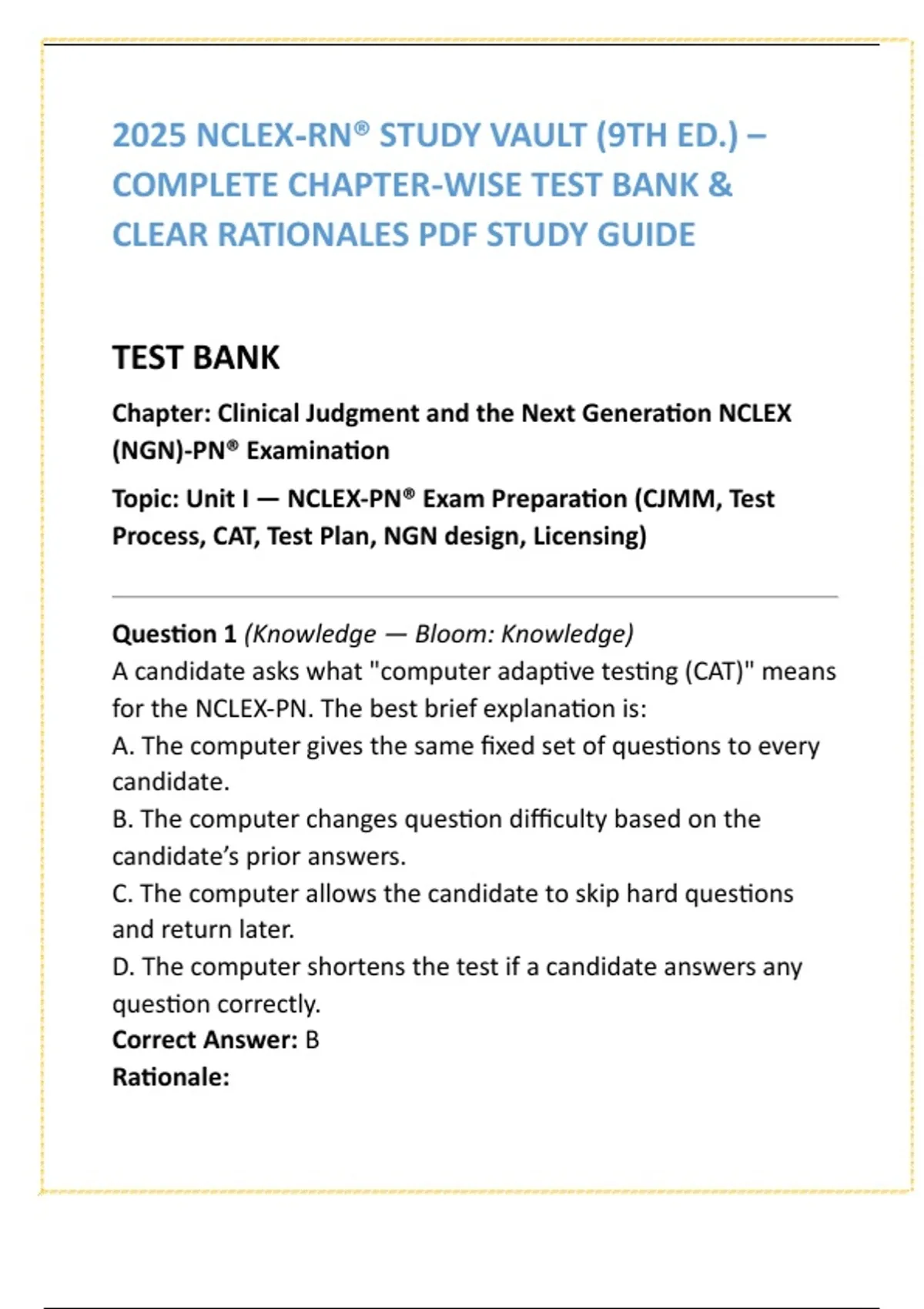 NCLEX-PN 2025 Practice Qs — Saunders-Style Study Guide NCLEX-PN 2025 Saunders-Style Practice Questions | 70 Chapters | 20 MCQs + Rationales Per Chapter | PN Exam Prep PDF Original NCLEX-PN 2025 Saunders-Style Practice Question Study Guide — 70 Chapters — 20 MCQs + Detailed Rationales Per Chapter (PDF) — Not the Saunders Textbook 10 SEO keywords (comma-separated, numbered 1–10) NCLEX-PN practice questions, NCLEX PN 2025 study guide, Saunders-style NCLEX PN, PN nursing exam prep PDF, NCLEX PN chapterwise test bank, NCLEX PN rationales practice, international PN exam study, PN student NCLEX review, next gen NCLEX PN 2025 prep, NCLEX PN downloadable PDF 10 hashtags (comma-separated) #NCLEXPN, #SaundersStyle, #PNExamPrep, #NursingStudent, #StudyNursing, #NCLEX2025, #NextGenNCLEXPN, #NurseLifeStudent, #NursingSchoolHelp, #PNReview Short description (150–220 chars) 70-chapter NCLEX-PN 2025 Saunders-style practice question study guide. Each chapter includes 20 original MCQs with answers + rationales. Instant PDF download for PN students, new grads, and international nurses. Long description (450–900 chars) NCLEX-PN practice questions designed for the 2025 exam — created in Saunders-style to build real clinical judgment confidence. This original study guide helps PN students master content faster, reduce overwhelm, and study in organized, chapter-based focus. Features: • 70 chapters • 20 MCQs + detailed rationales per chapter • PDF format (mobile + tablet friendly) • Chapter-level structure for targeted review What’s included: NGN-style reasoning, priority concepts, progressive difficulty, test-taking strategy cues, and clinical-reasoning development — without memorization burnout. 30-day money-back if misrepresented. This is an original study guide/compilation — not the Saunders textbook. CTA: Download the PDF now to start practicing with high-yield, Saunders-aligned NCLEX-PN chapter questions.