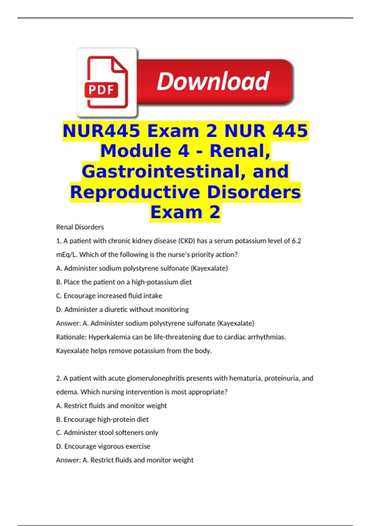 1. A patient with chronic kidney disease (CKD) has a serum potassium level of 6.2