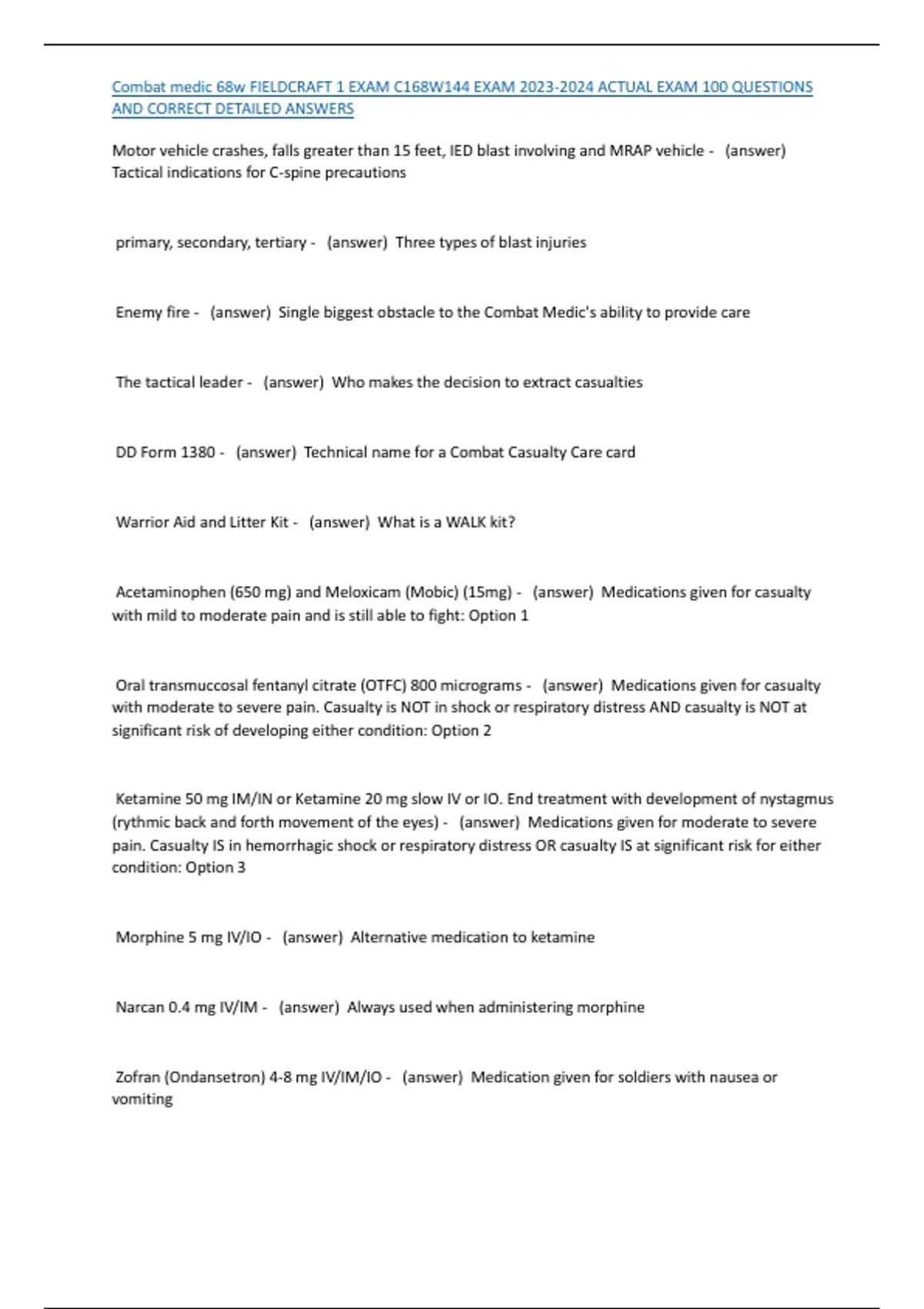 , Combat medic 68w FIELDCRAFT 1 EXAM C168W144 EXAM 2023-2024 ACTUAL EXAM 100 QUESTIONS