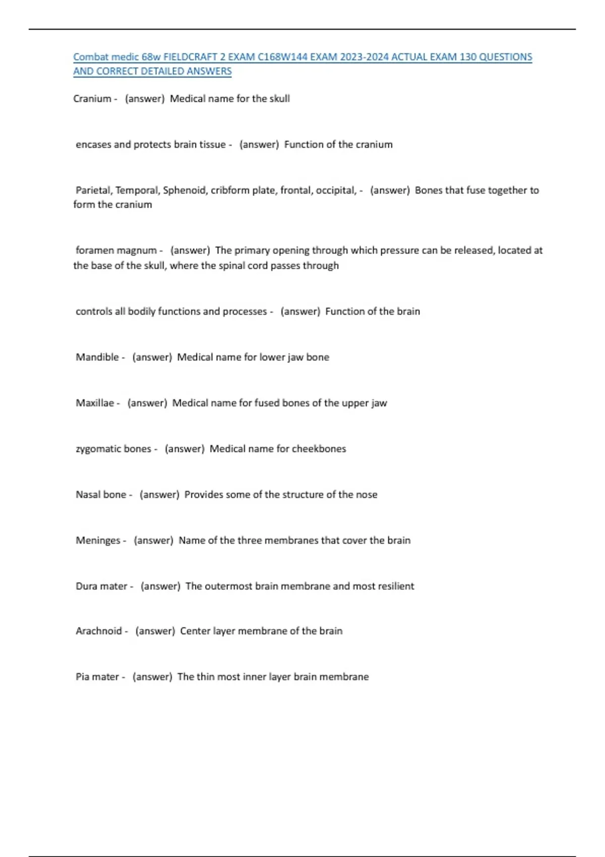 Combat medic 68w FIELDCRAFT 2 EXAM C168W144 EXAM 2023-2024 ACTUAL EXAM 130 QUESTIONS