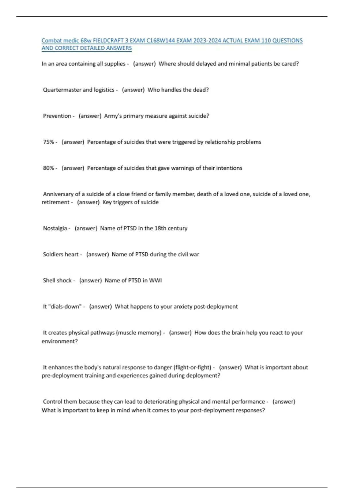 Combat medic 68w FIELDCRAFT 3 EXAM C168W144 EXAM 2023-2024 ACTUAL EXAM 110 QUESTIONS
