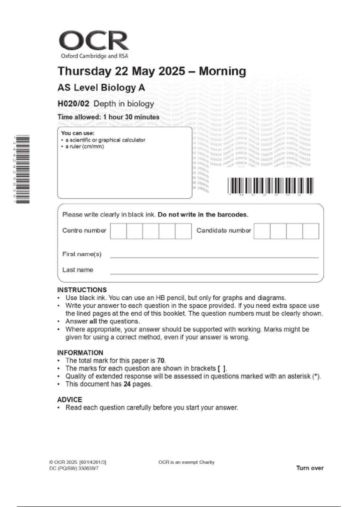 AS LEVEL BIOLOGY A JUNE 2025 (DEPTH IN BIOLOGY) QUESTION PAPER H020/02